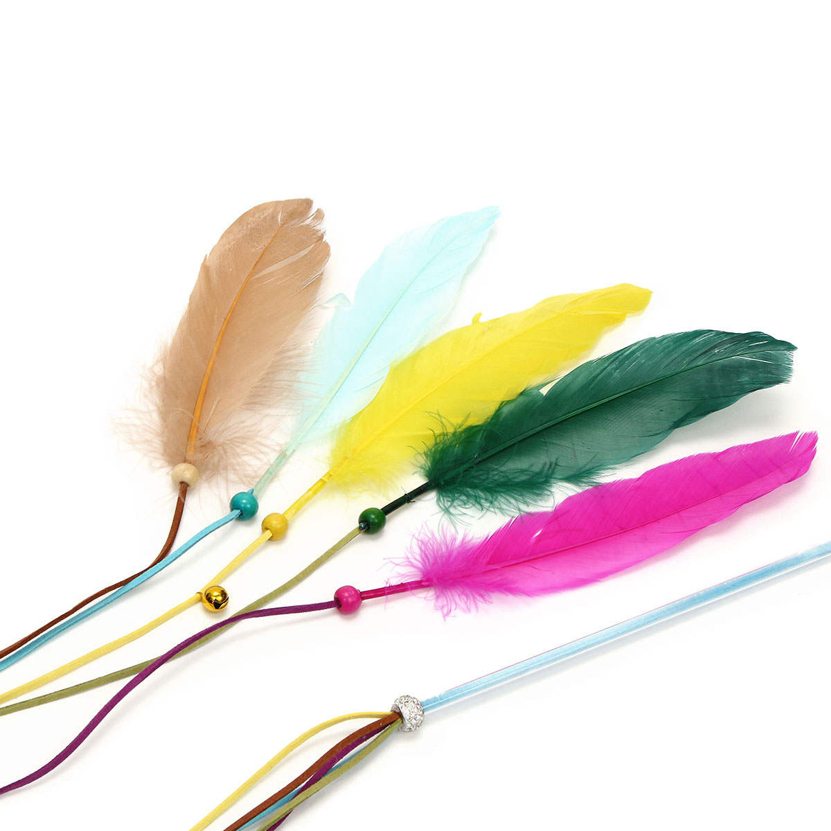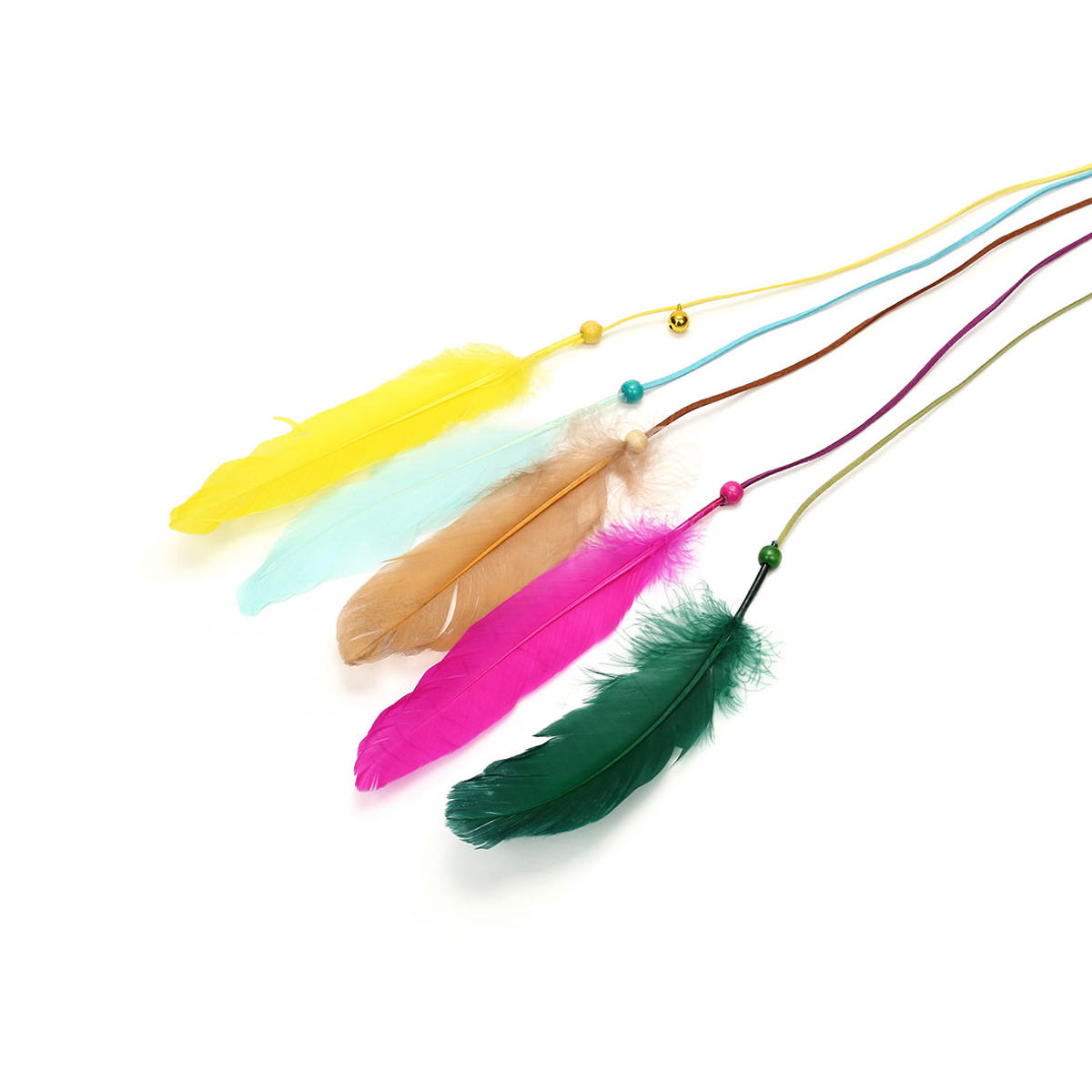 カラフルな5枚の羽が紐の先でふわりと舞い、思わず飛びつきたくなる動きを見せる猫じゃらしです。揺れるたびに小さな鈴が可愛い音を響かせ、自然と猫ちゃんの集中力を引き出します。さらにキラキラ輝くヘッドアクセサリーが視線をキャッチし、遊びの時間をいっそう楽しく盛り上げます。