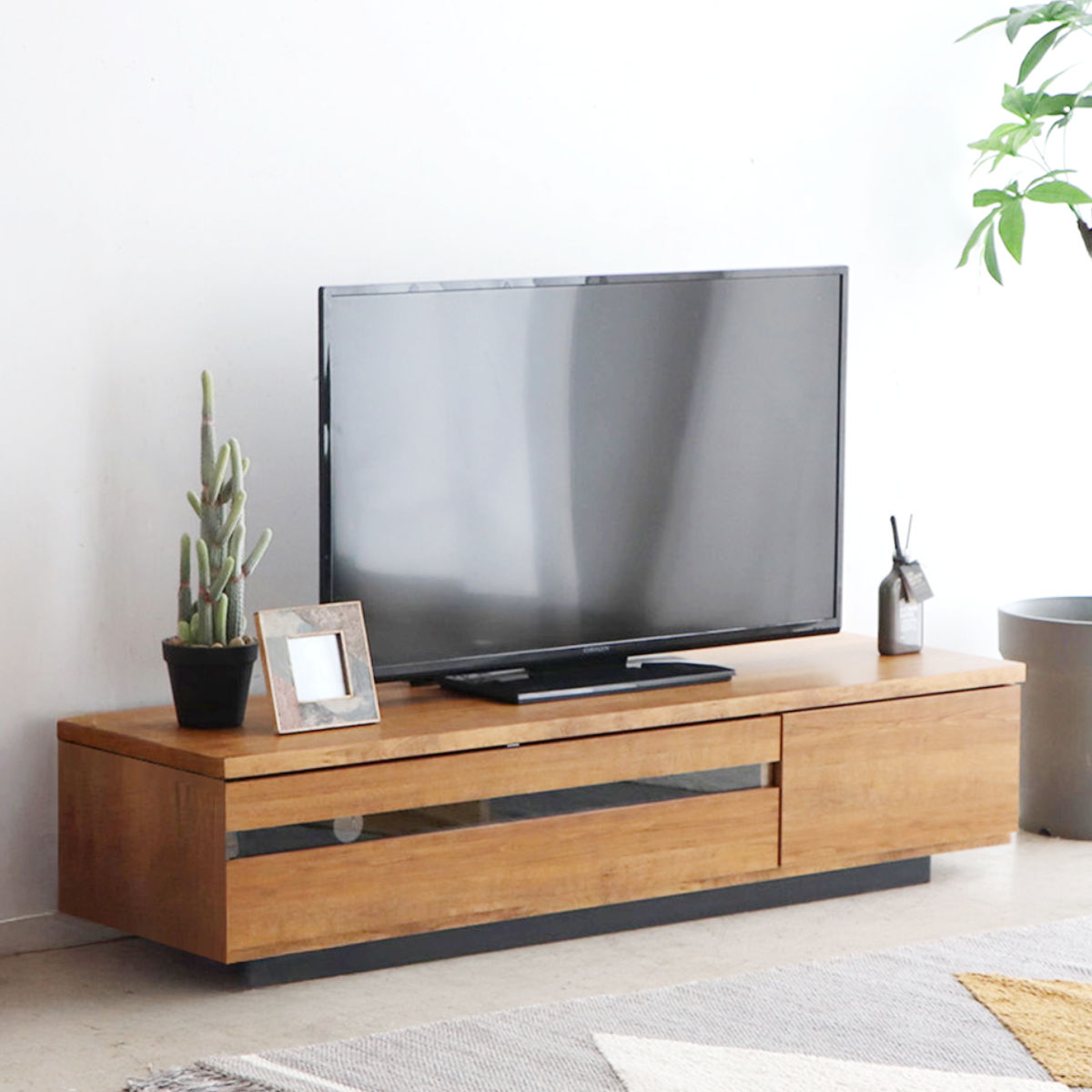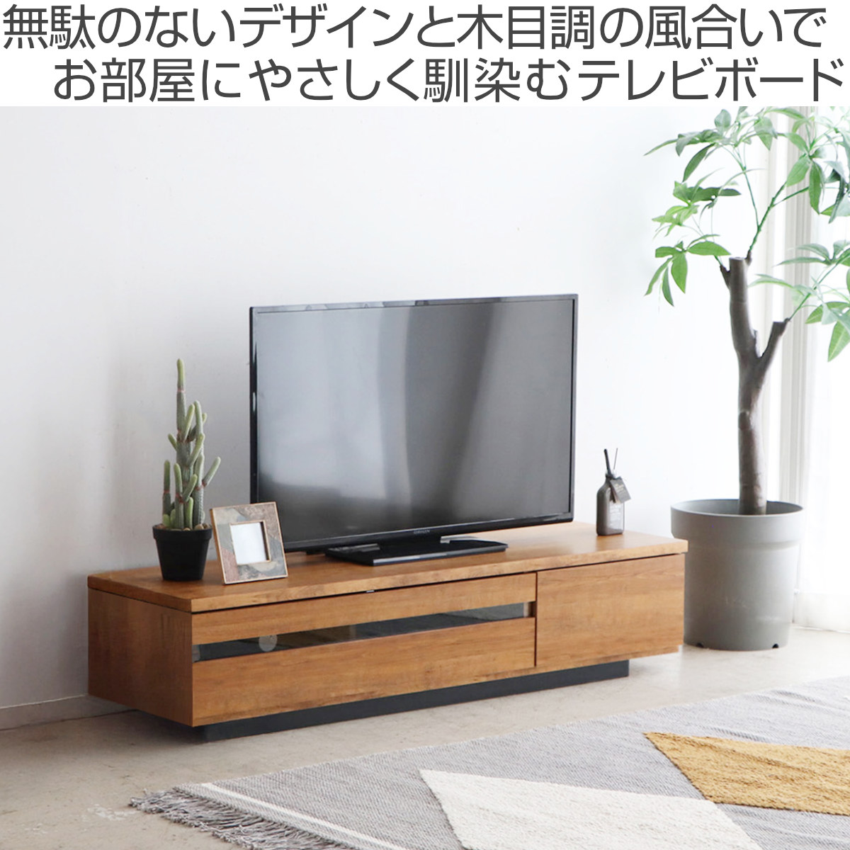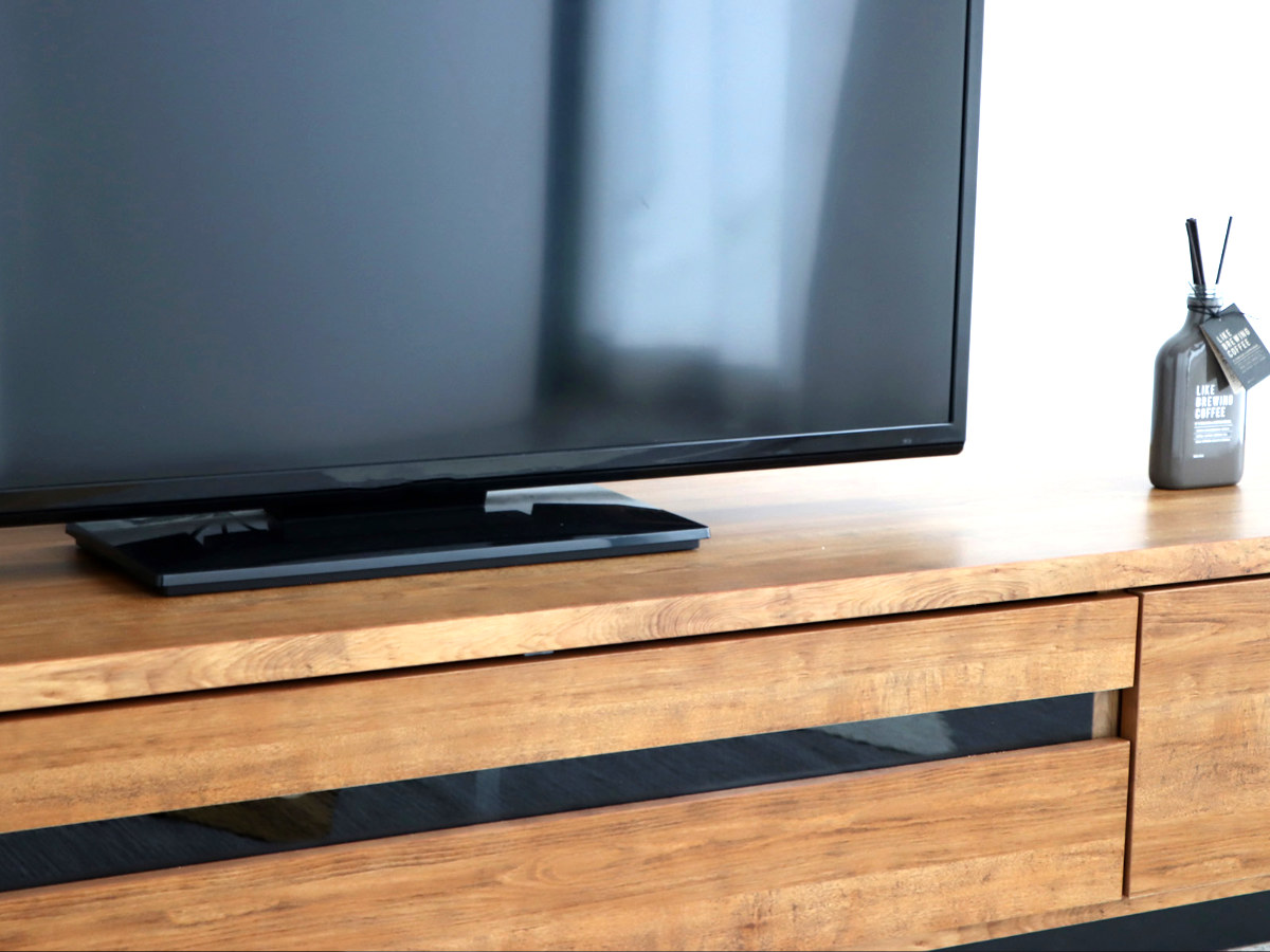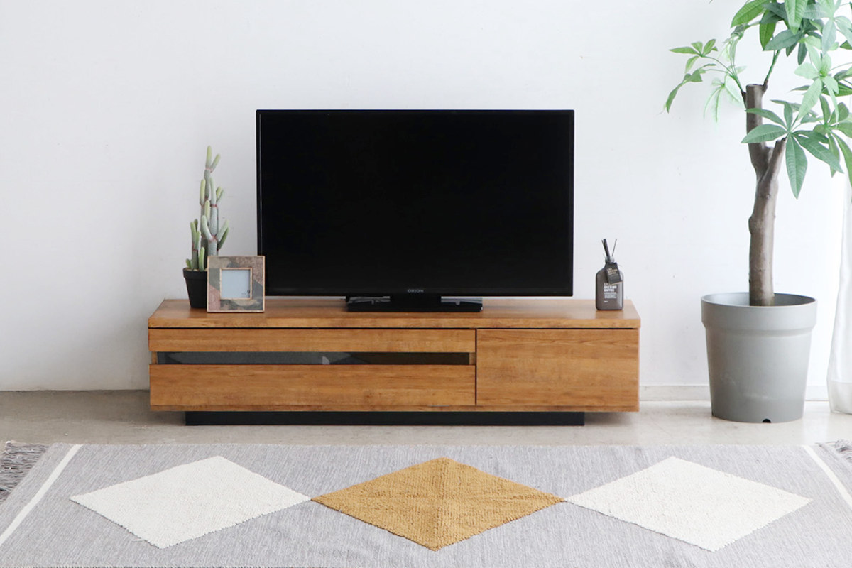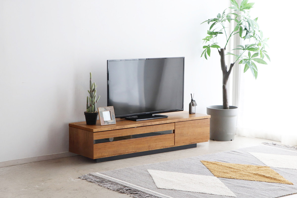 無駄のないデザインに上質な木目調で、どんなお部屋にも自然に馴染む、テレビボードです。幅148.5cmサイズは、コンパクトながら大型テレビも置ける設計で、リビングに自然に馴染みます。