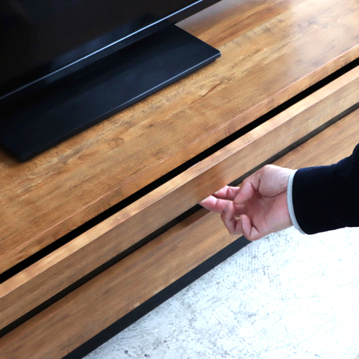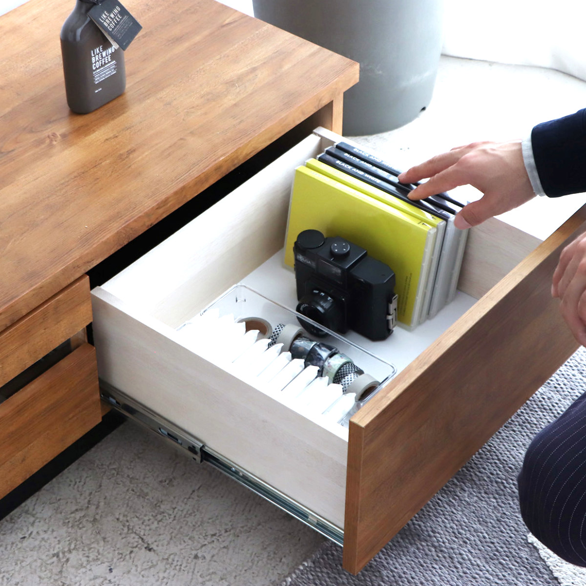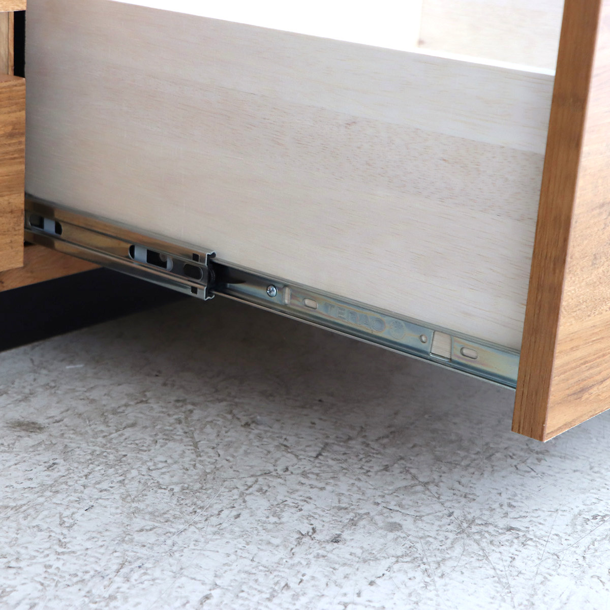 引き出しにはフルスライドレールを採用。軽い力でスーッと開閉でき、毎日の出し入れもストレスなく行えます。奥までしっかり引き出せるので、収納物も見やすく取り出しやすい設計です。