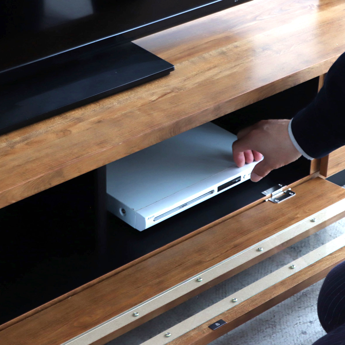 扉内の棚には、AV機器や小物を置くことができ、見た目をすっきり保ちながら、使いやすく収納できます。
