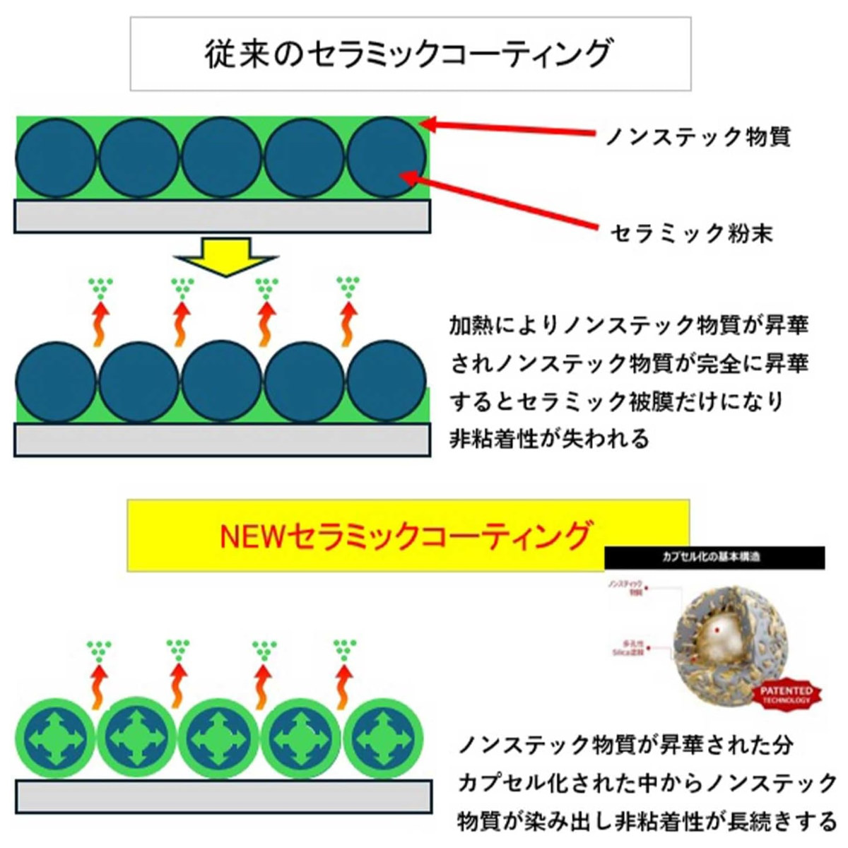 NEWセラミックコーティングを採用し、滑りのよさが長持ちするようになりました。加熱によって表面の非粘着物質が昇華された際に、セラミック粉末内から新たな非粘着物質が染み出す仕組みです。