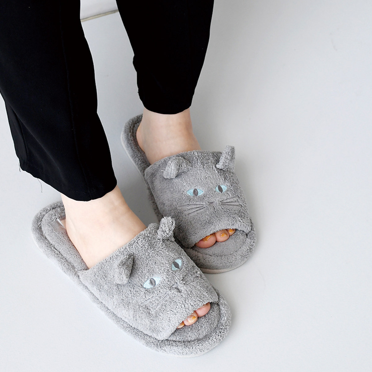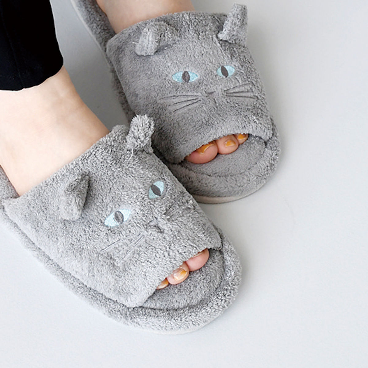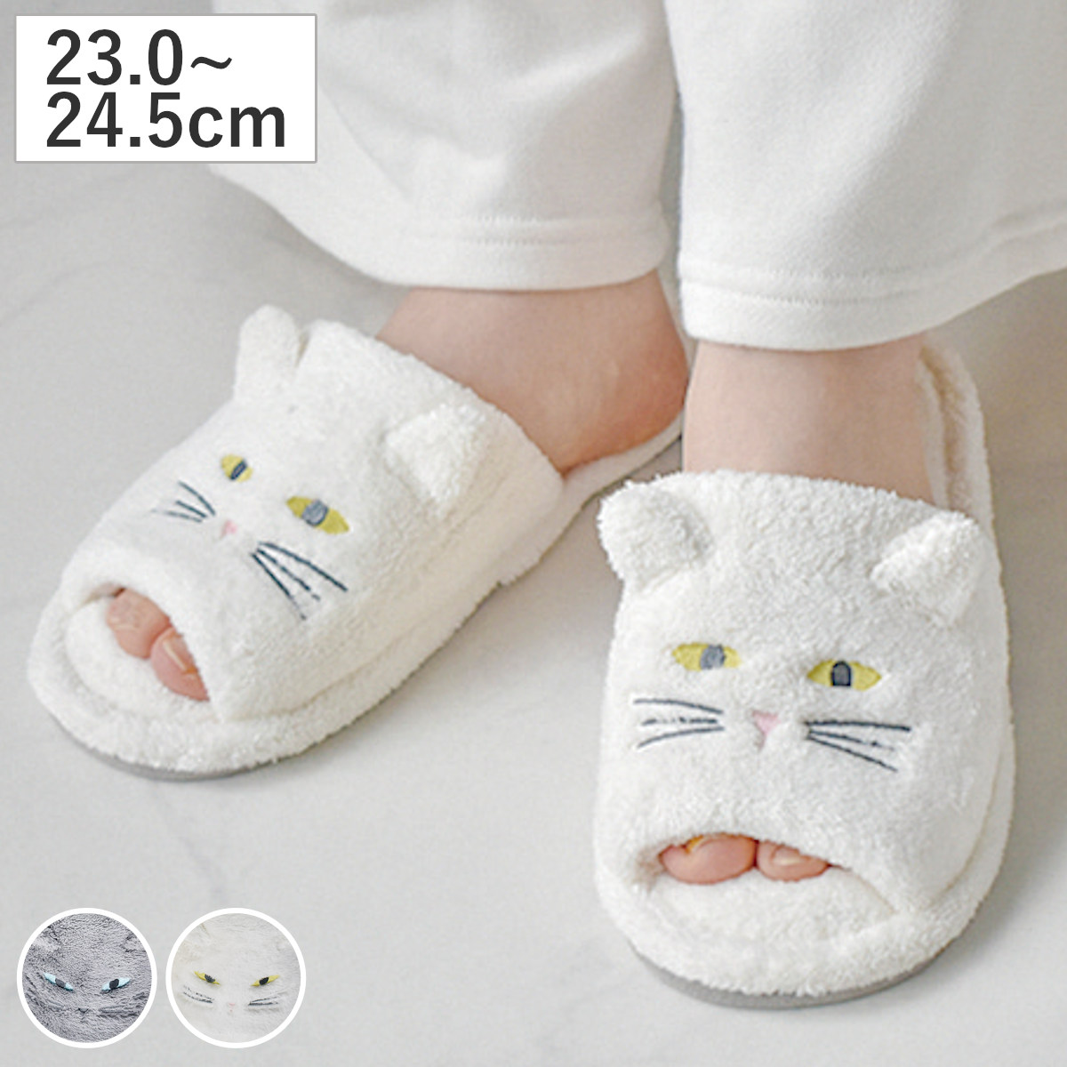 履くだけで気分が上がるグレーとホワイトの猫モチーフが魅力的な、見た目にも癒されるデザインです。毎日の暮らしにやさしさと可愛らしさをプラスします。
