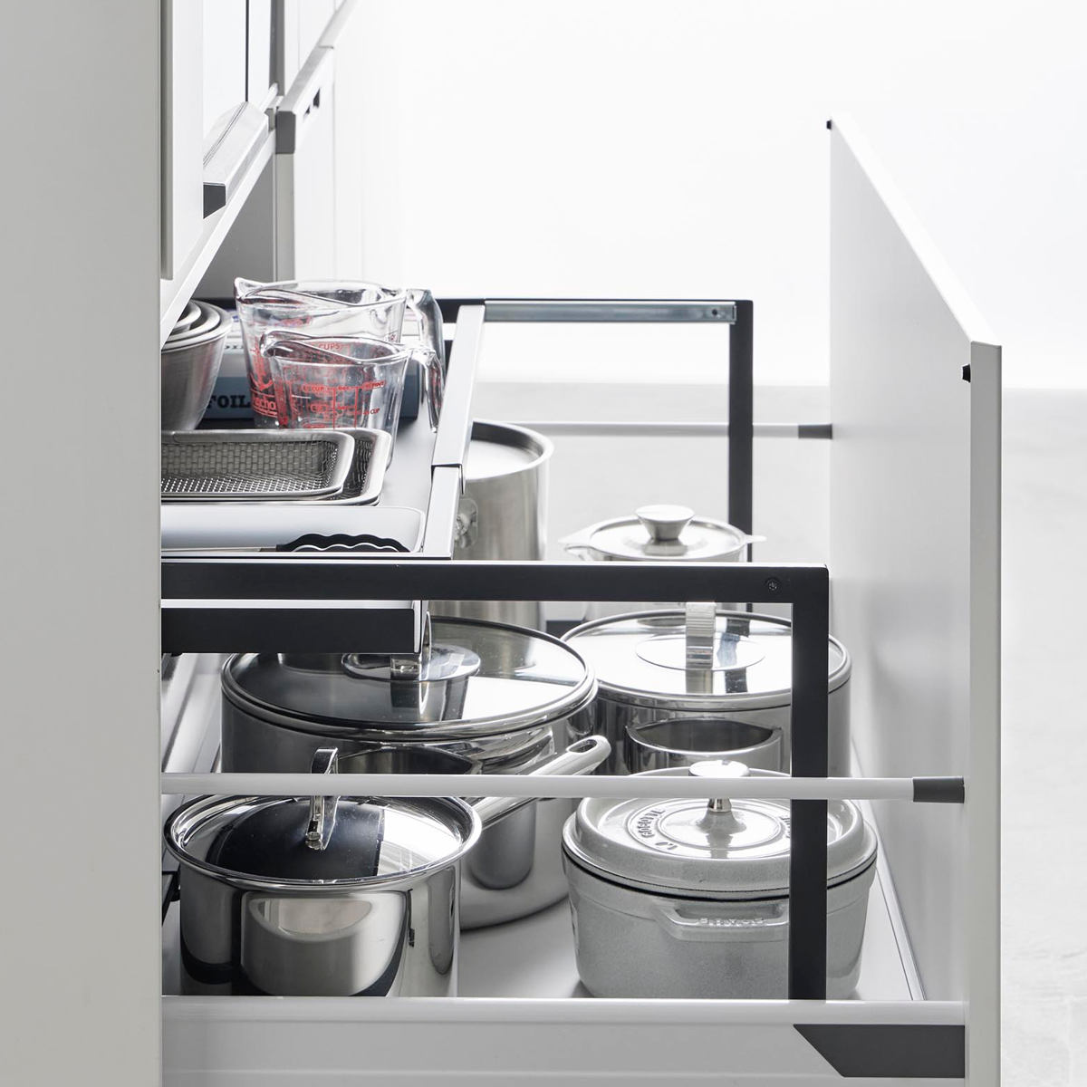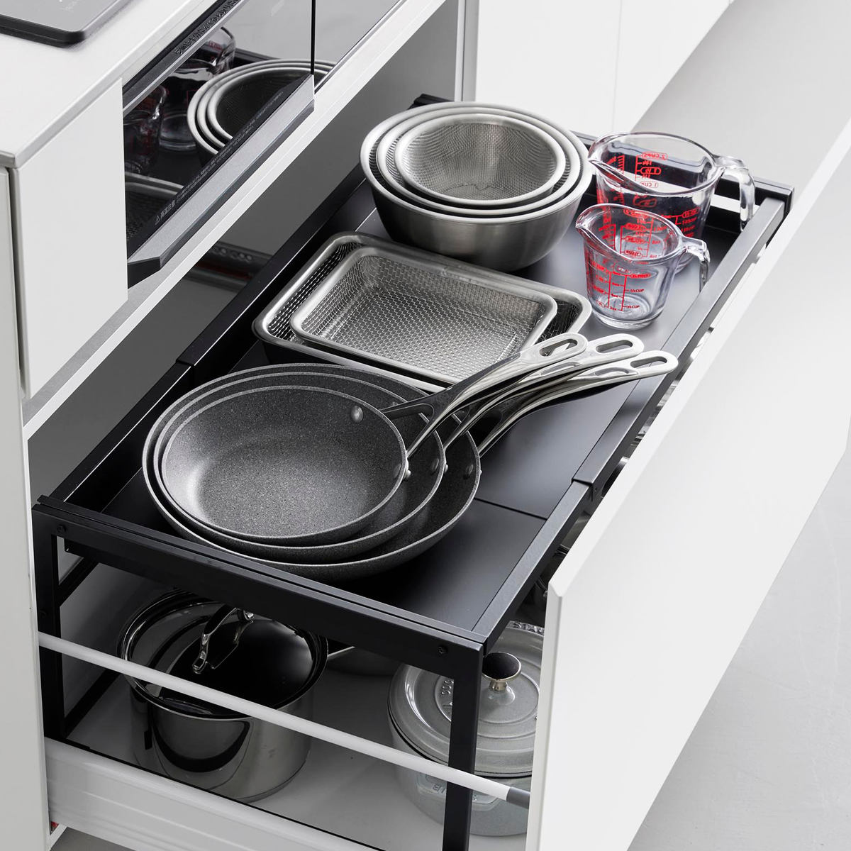 調理でよく使うフライパンなどの収納にも便利です。引き出しを開けてサッと取れる場所によく使う物を置いておくと作業がスムーズにできます。