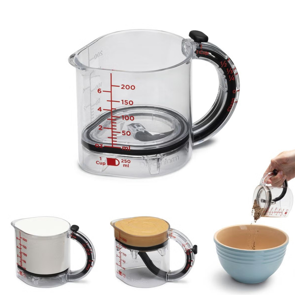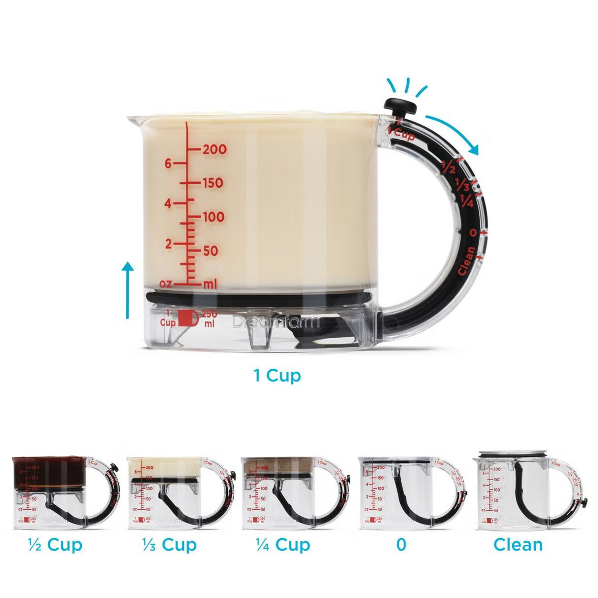 ●1つのカップで複数計量でき、250ml(1カップ)から1/2、1/3、1/4カップまで調整できます。