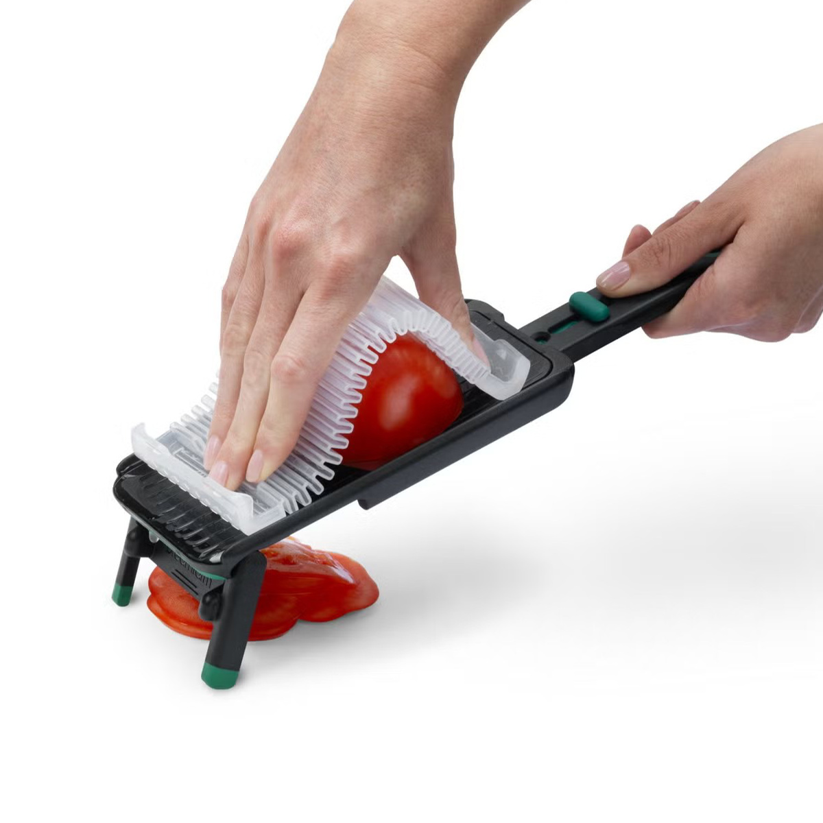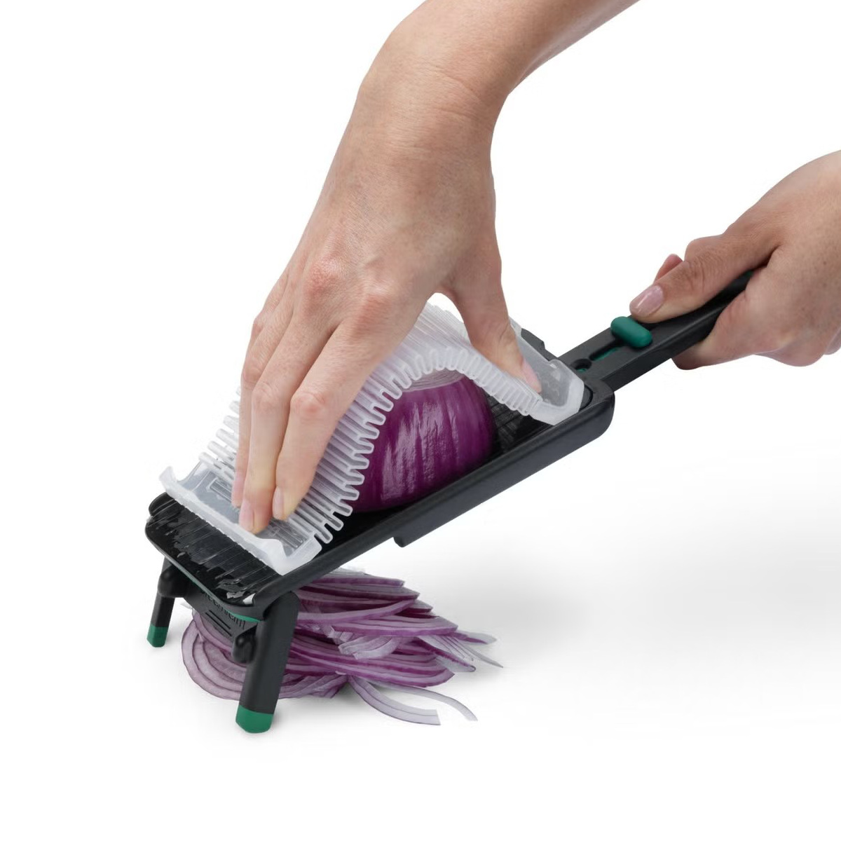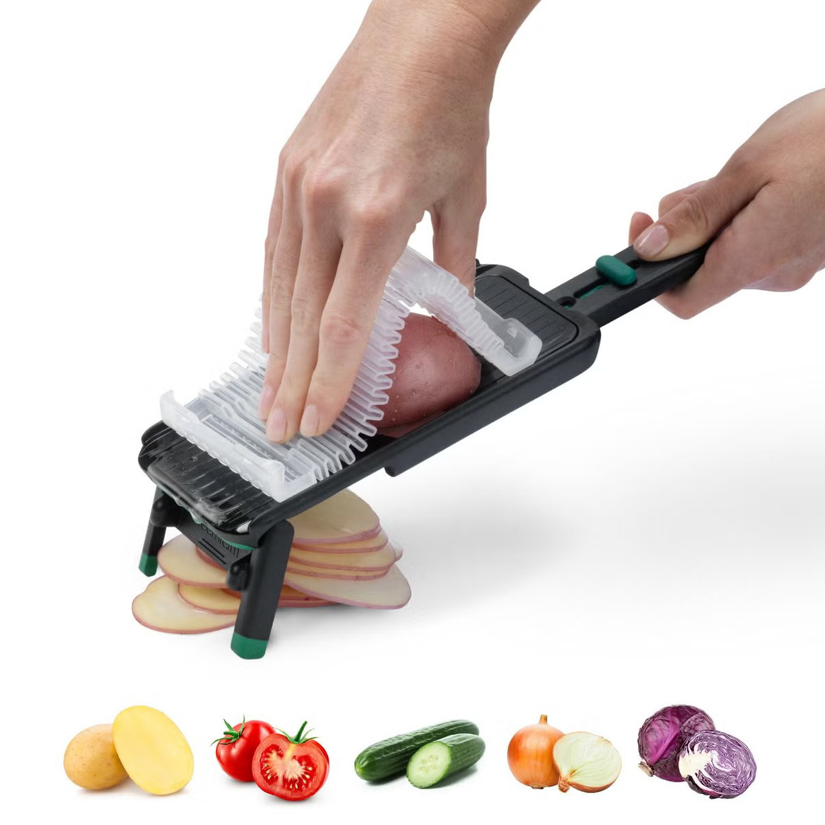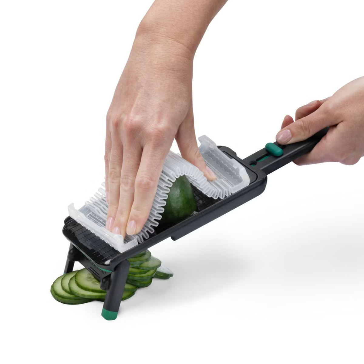 スライサーと指ガードがセットになった商品です。指ガードが食材をしっかり固定しながら刃の上を滑るので、安全に最後の一枚までスライスできます。