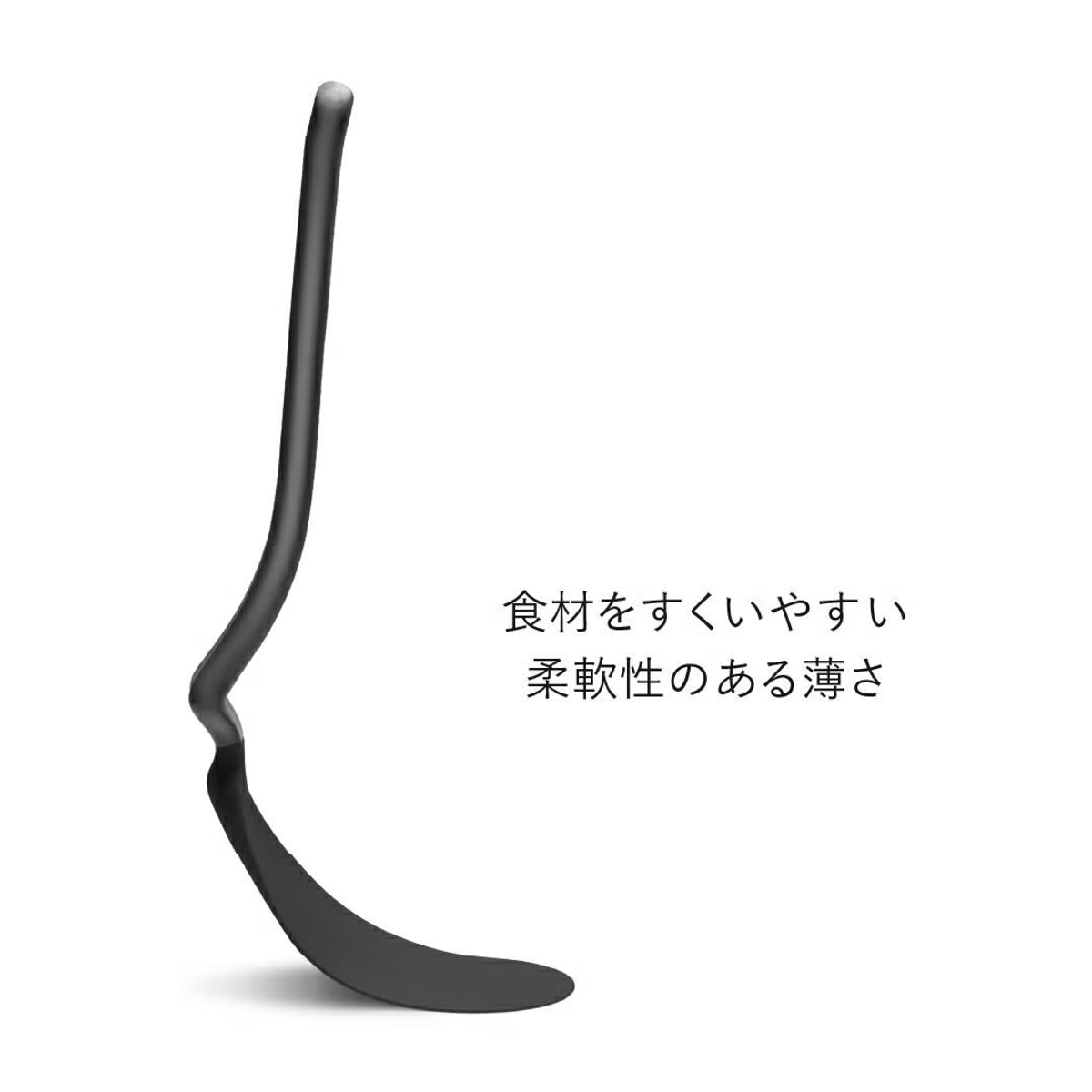 食材の下にスッと差し込みやすいフライ返しです。薄く柔軟性があり、繊細な食材も崩しにくく、きれいな仕上がりをサポートします。しなりのあるヘラ部分がフライパンに沿い、ストレスなくすくい上げることができます。
