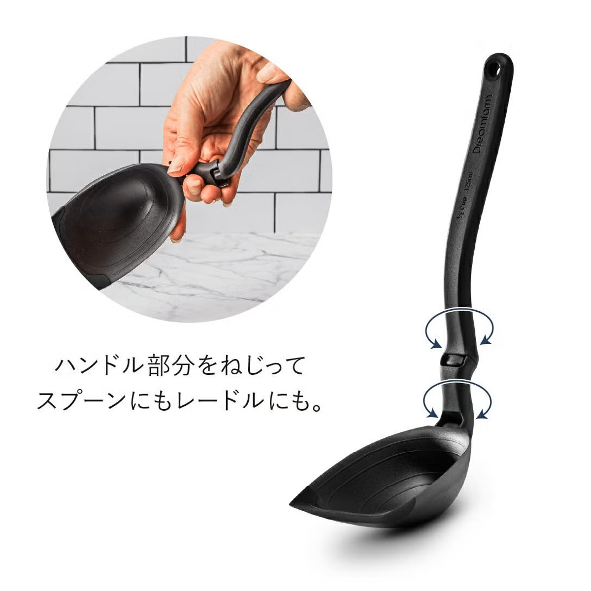 ●ハンドル部分をねじるだけで形状を切り替えられる便利なおたまです。
