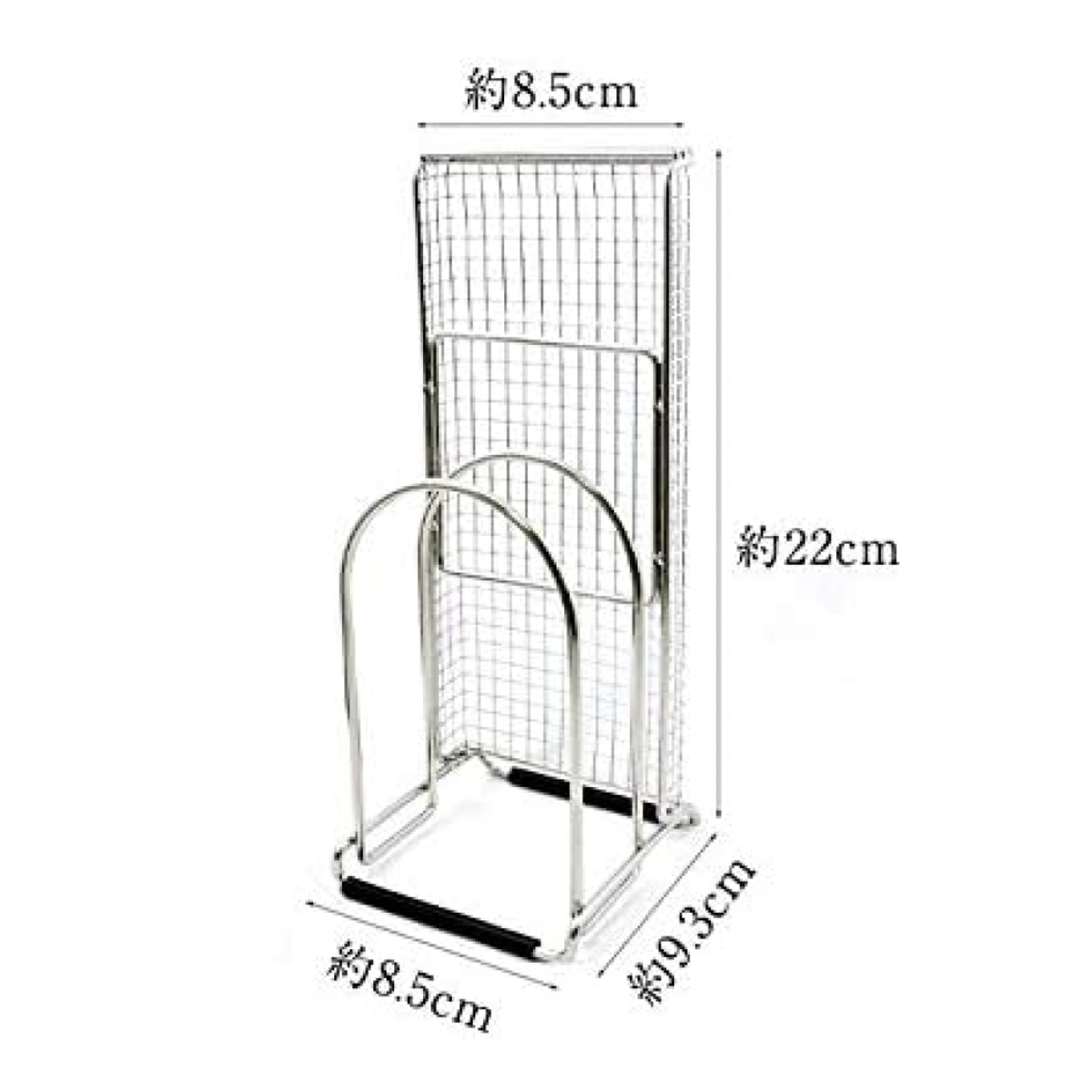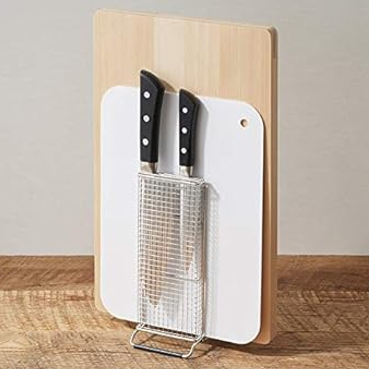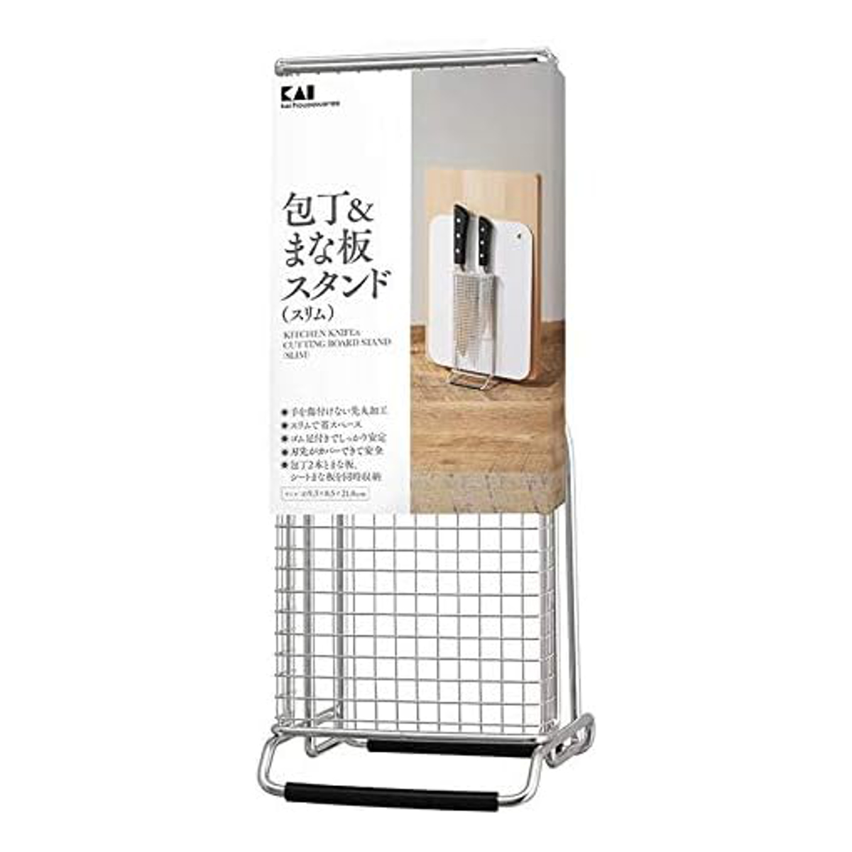 スリム設計で省スペースの包丁&まな板スタンドです。包丁2本とまな板、シートまな板をまとめて収納できます。メッシュカバー付きで刃先が直接当たりにくく、安全に配慮した設計です。