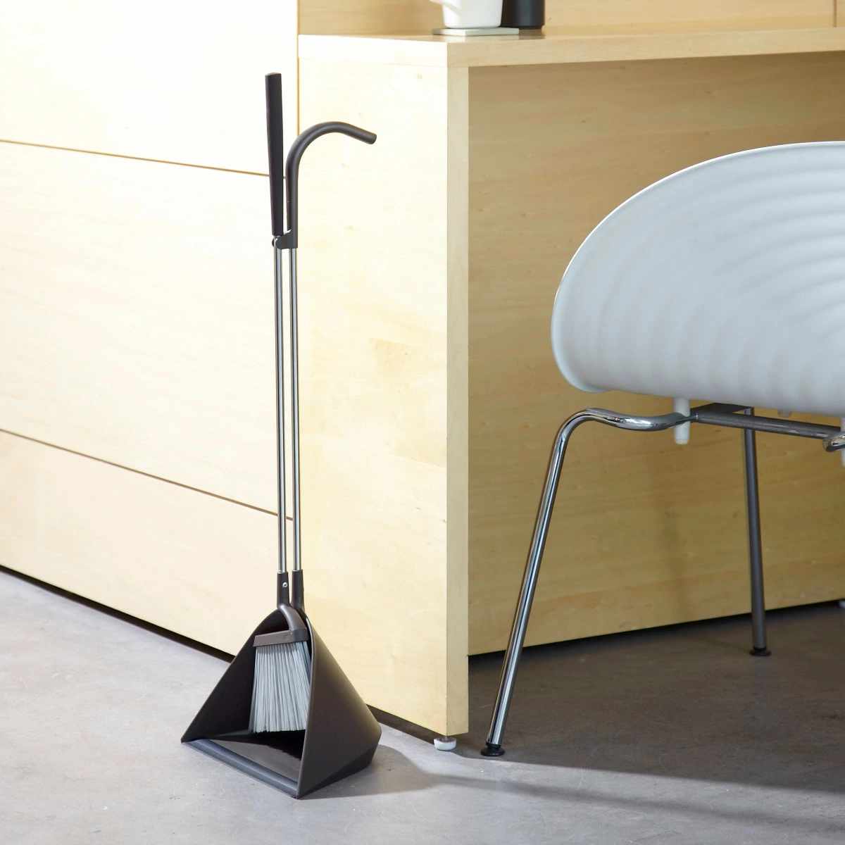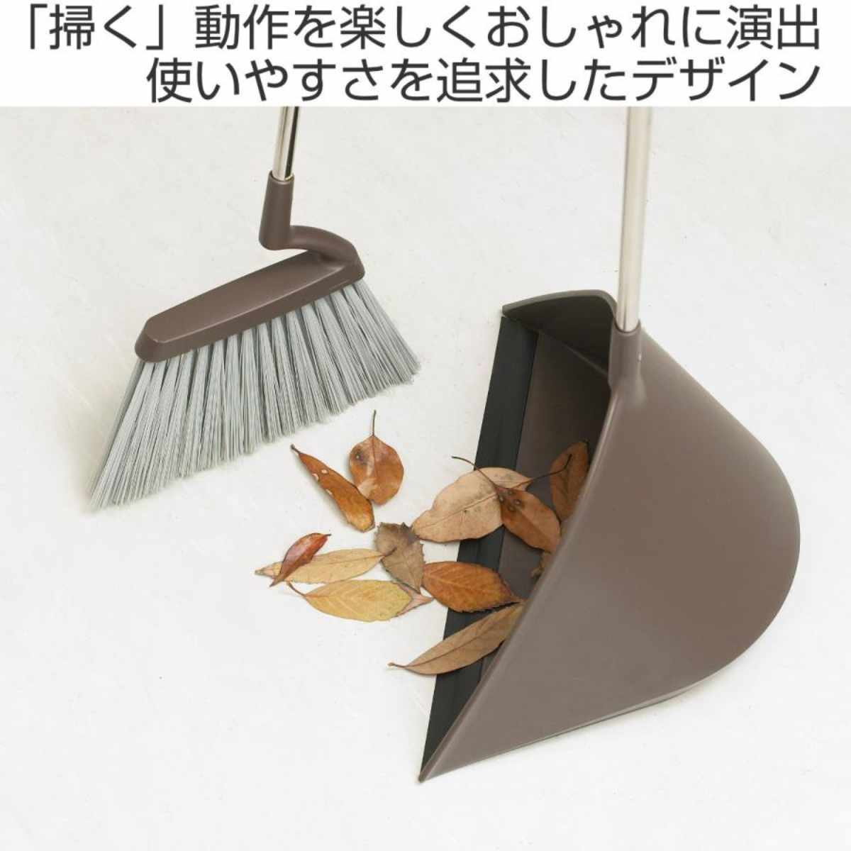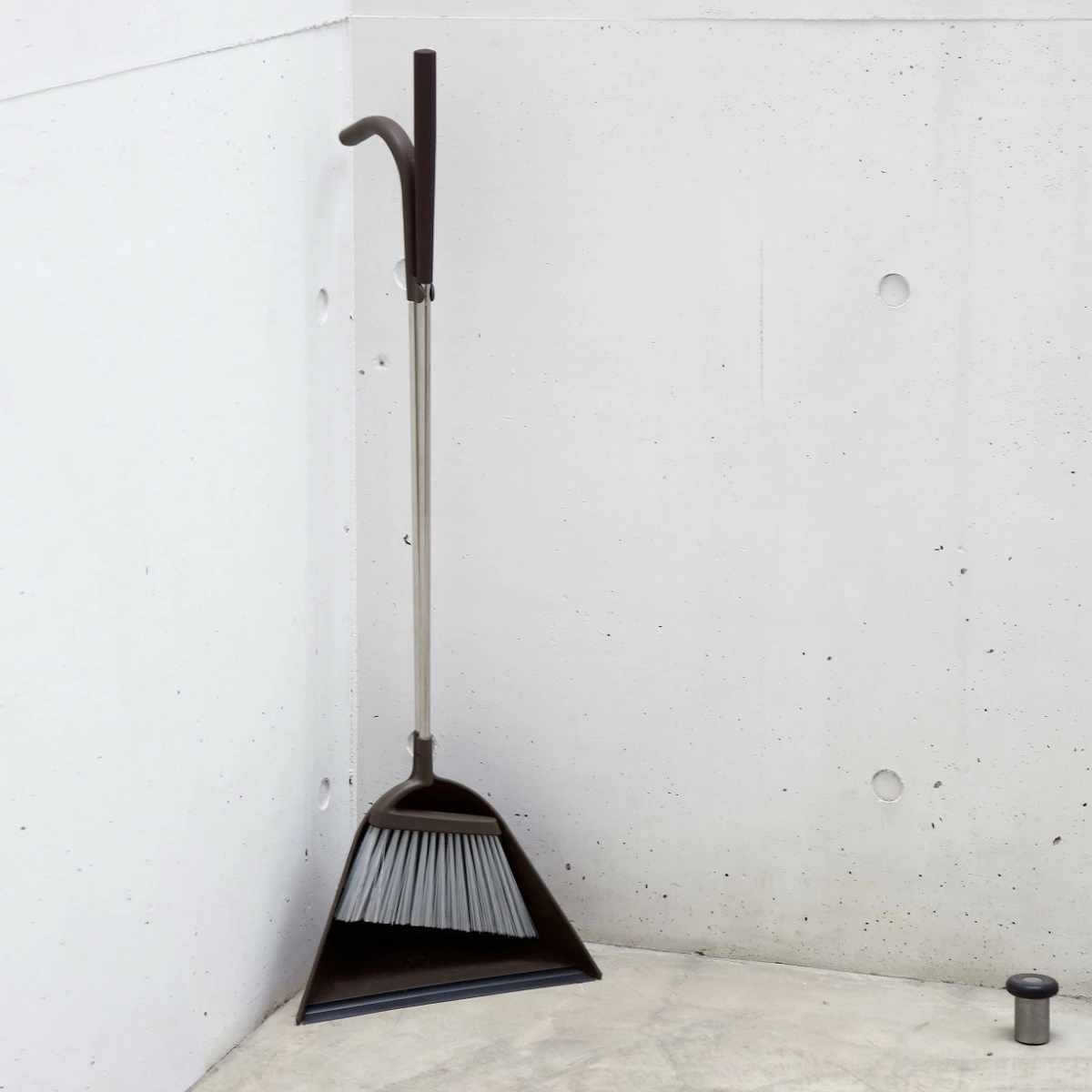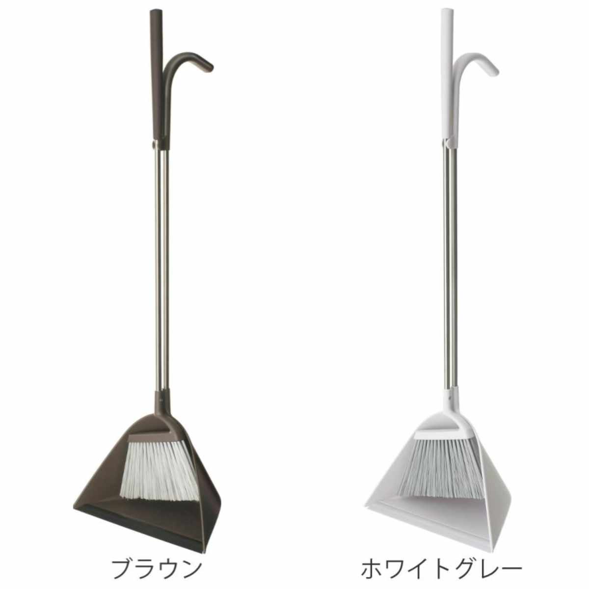 ほうきとちりとりがセットで自立し、玄関やガレージなどよく使うところにスッキリと収まるデザインです。オフィスやお店などでも違和感なく置いておけます。