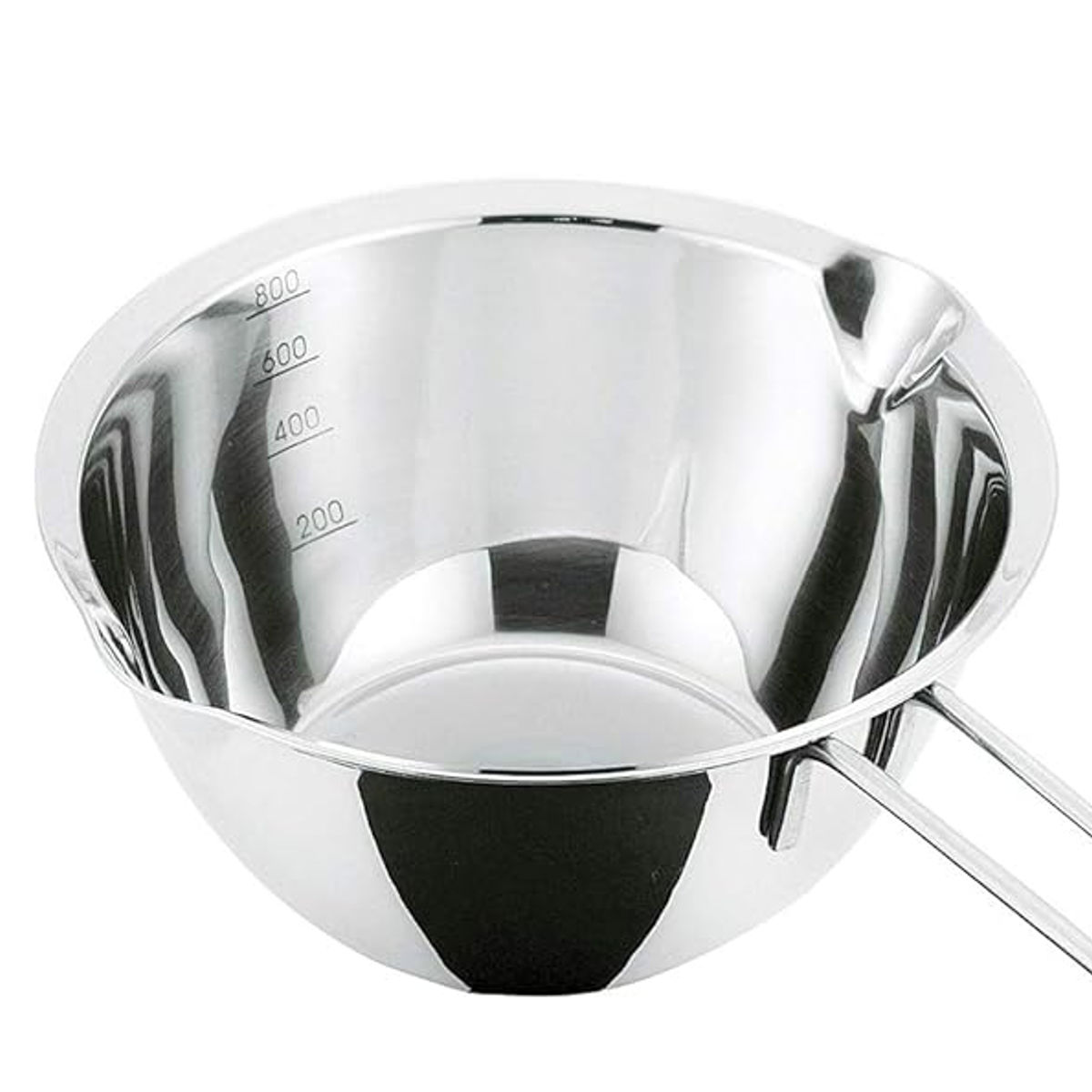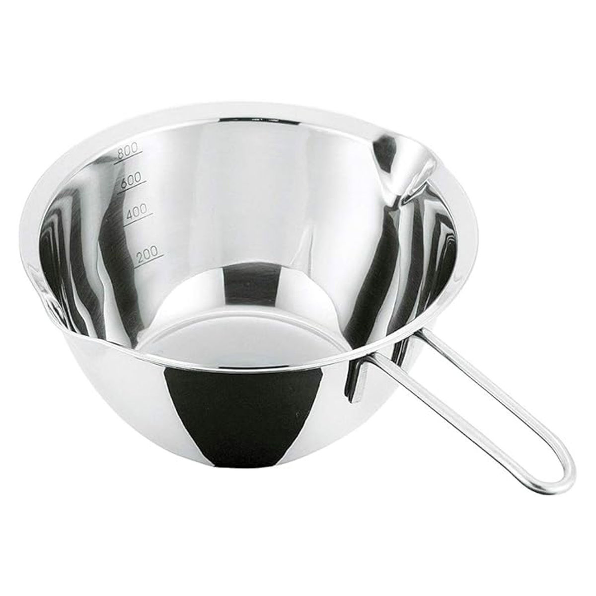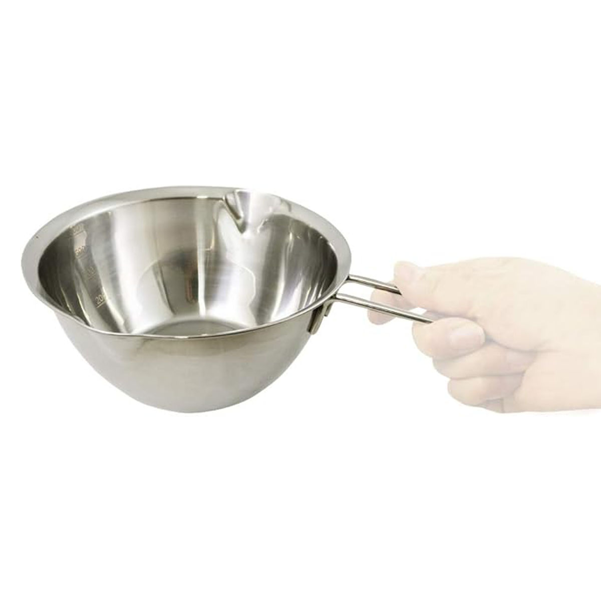丈夫で衛生的なステンレス製の柄付きボウルです。におい移りしにくく、清潔にお使いいただけます。内側に分量が一目でわかる目盛りが付いているので、計量カップを取り出す手間が省け、洗い物も減らせます。