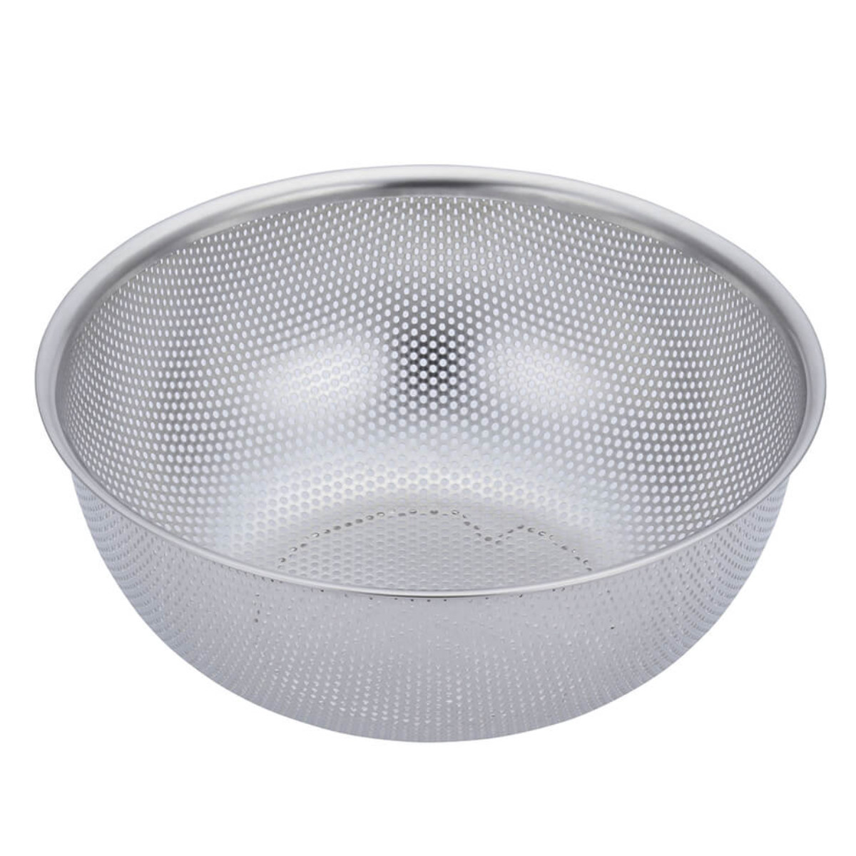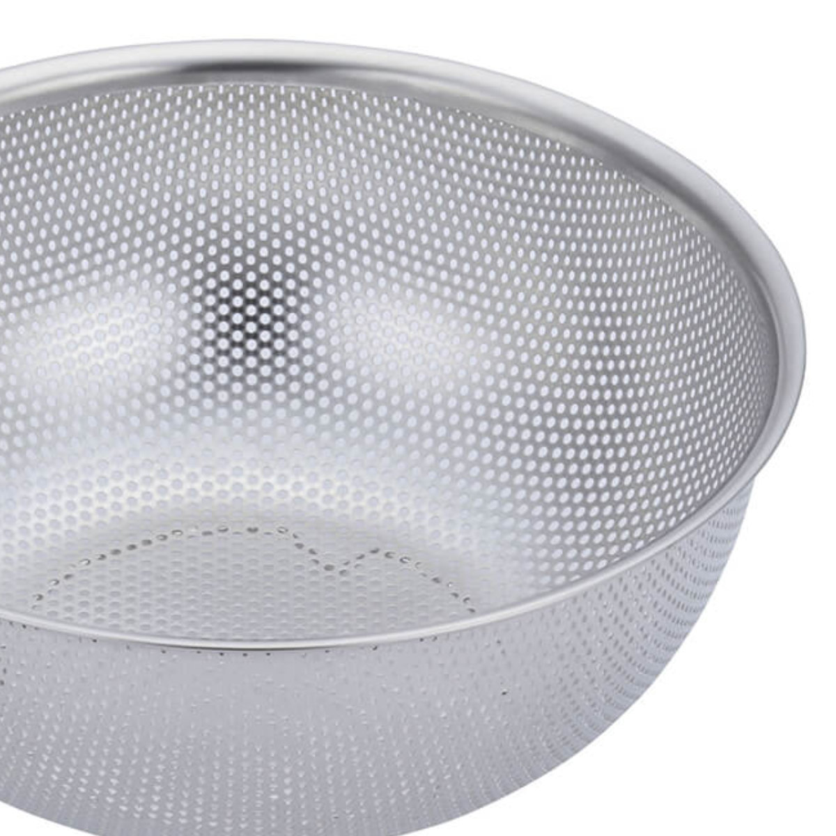 一枚絞り加工で、継ぎ目がないため変形しにくく、丈夫で長持ちします。細かなパンチング穴が均一にあいているので、水切れがよく、麺類や野菜の水切りもスムーズに行えます。