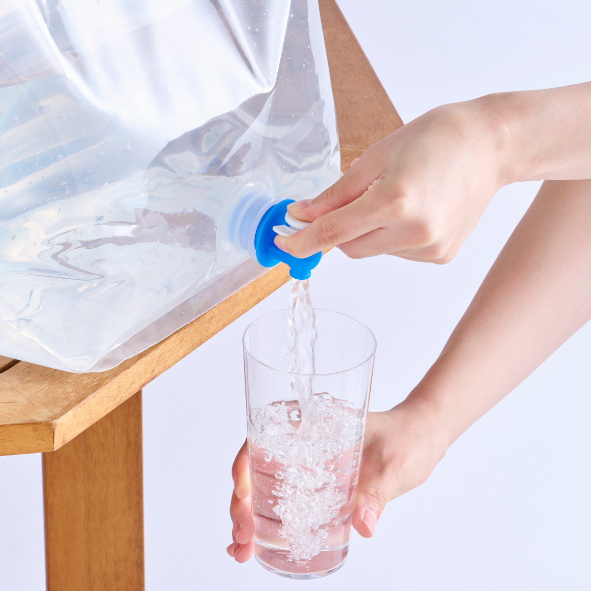 取っ手が付いているので飲料水を持ち運ぶのに便利です。底にマチが付いているため、水を入れると自立します。使わない時は空気を抜くとコンパクトサイズになるので、収納場所に困りません。