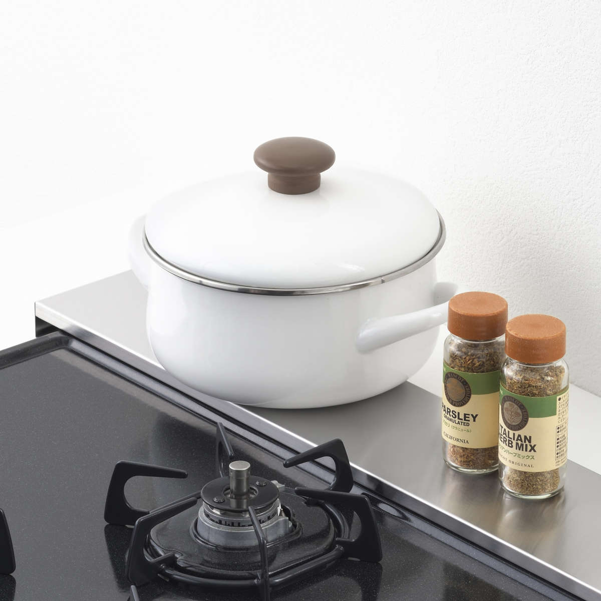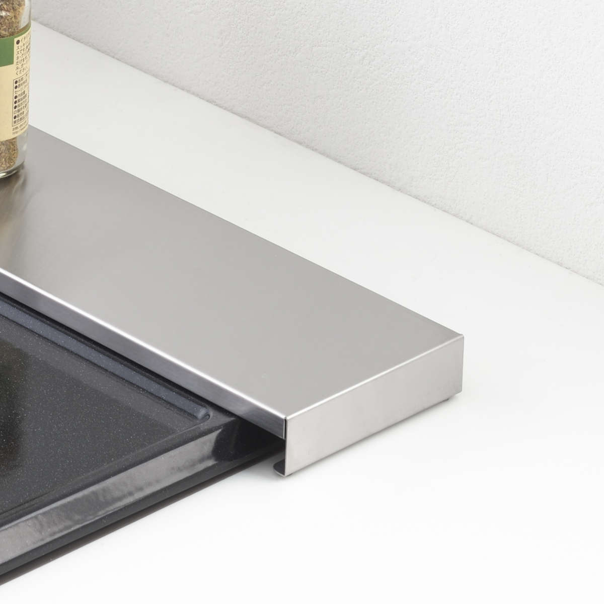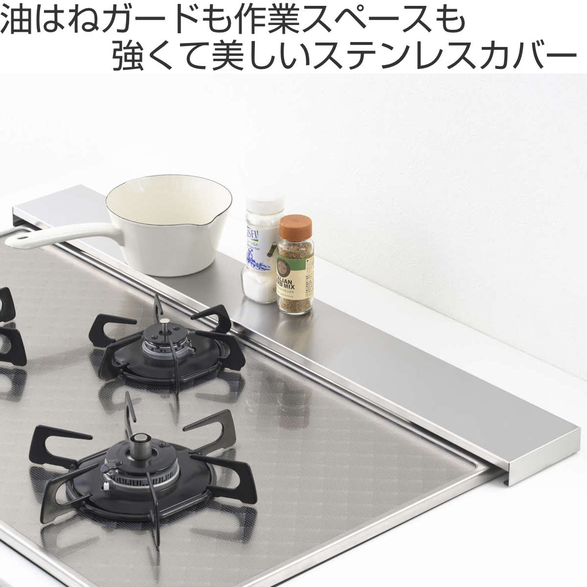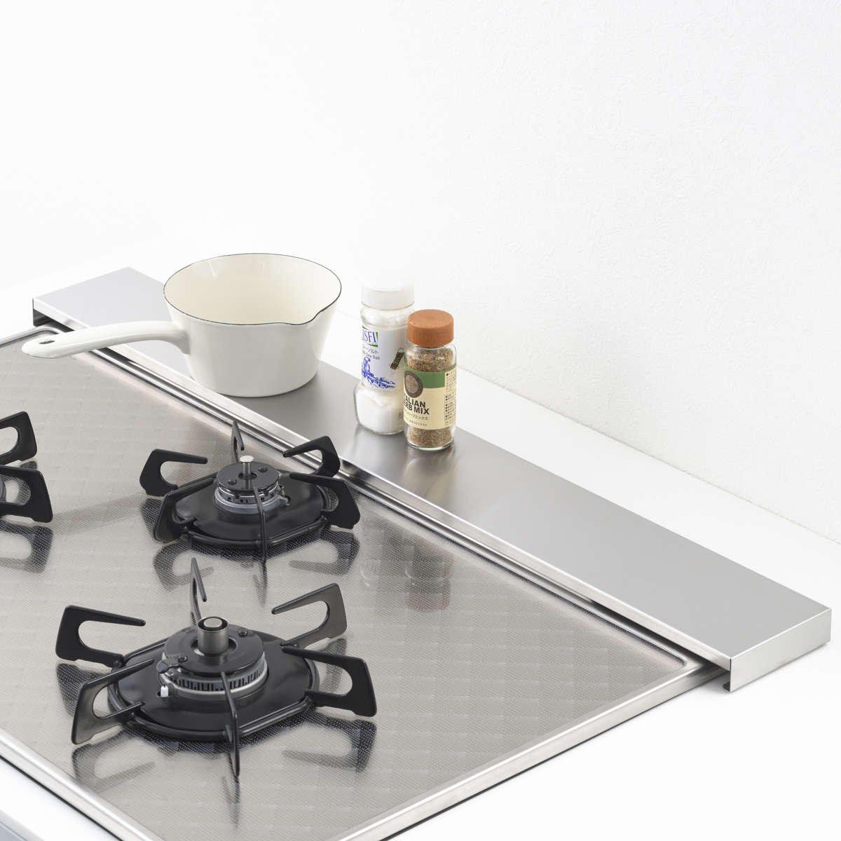 フラットな天面で調味料や鍋のフタをサッとちょい置きでき、耐荷重10kgのしっかりした強度で重めの調理器具も安心して置けます。コンロ奥のスペースを有効活用でき、調理中の作業効率が自然と上がります。