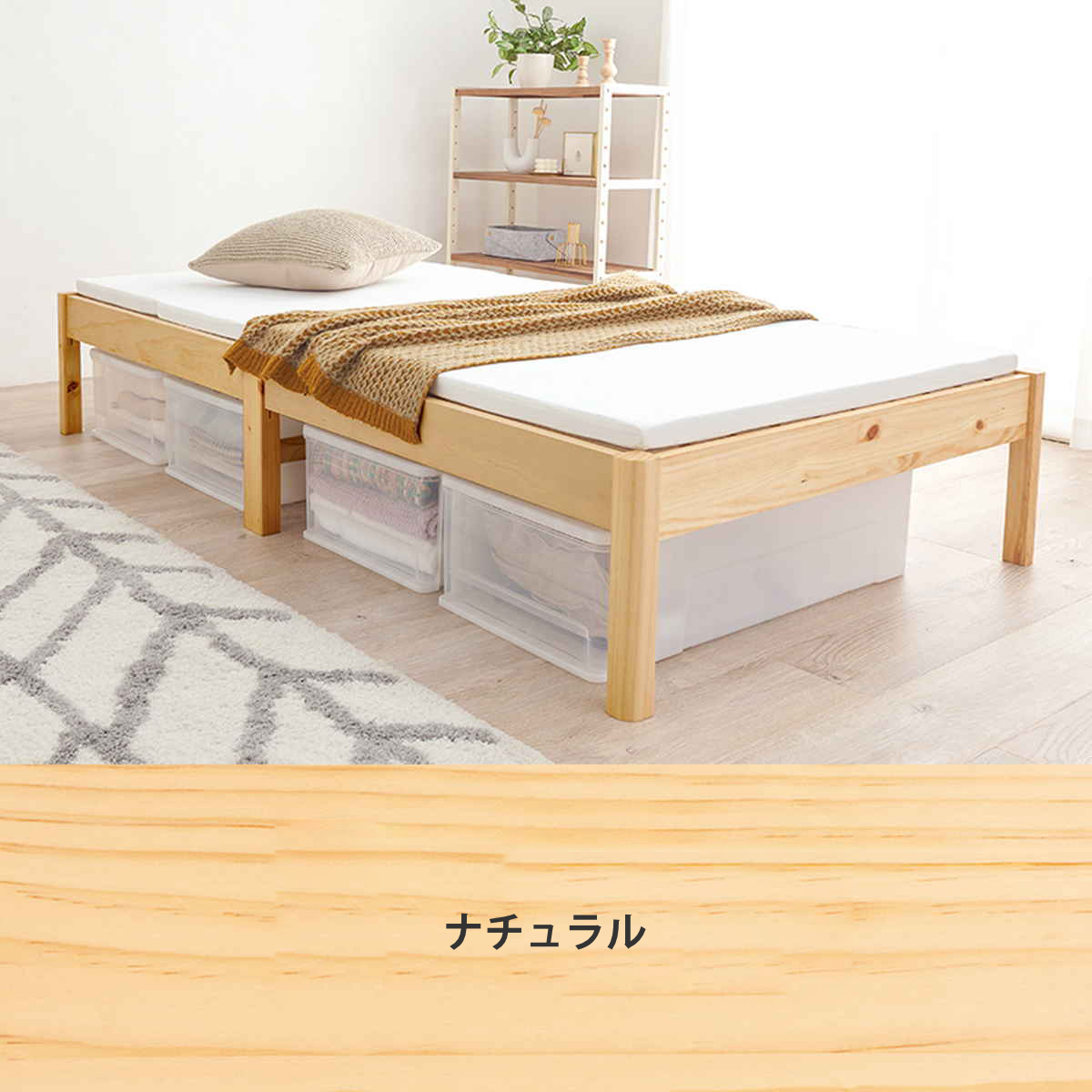 ネジや工具が不要で、簡単に組み立てられるベッドフレームです。パーツを差し込むだけなので、組み立て家具が苦手な方でもたった3分で組み立てることができます。天然木の温もりを感じられる柔らかなパイン材を使用しており、美しい木目と経年による色の変化も楽しめます。