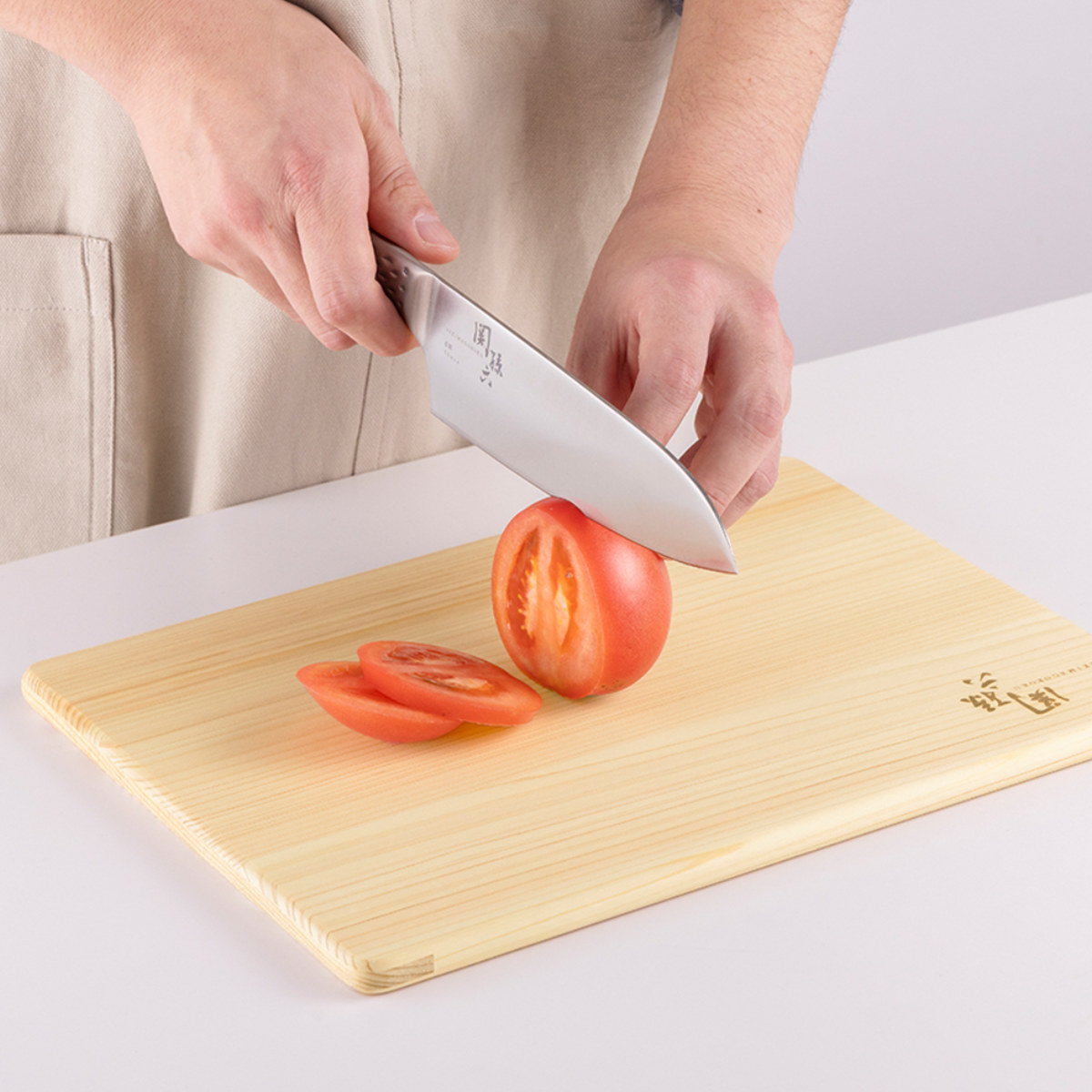 天然ひのきを使用した、軽くて扱いやすいまな板です。ひのき特有のやわらかな刃あたりで包丁の刃が傷みにくく、食材をきれいに切ることができます。天然木ならではの温かみのある質感が、キッチンにやさしく自然な風合いを添えます。