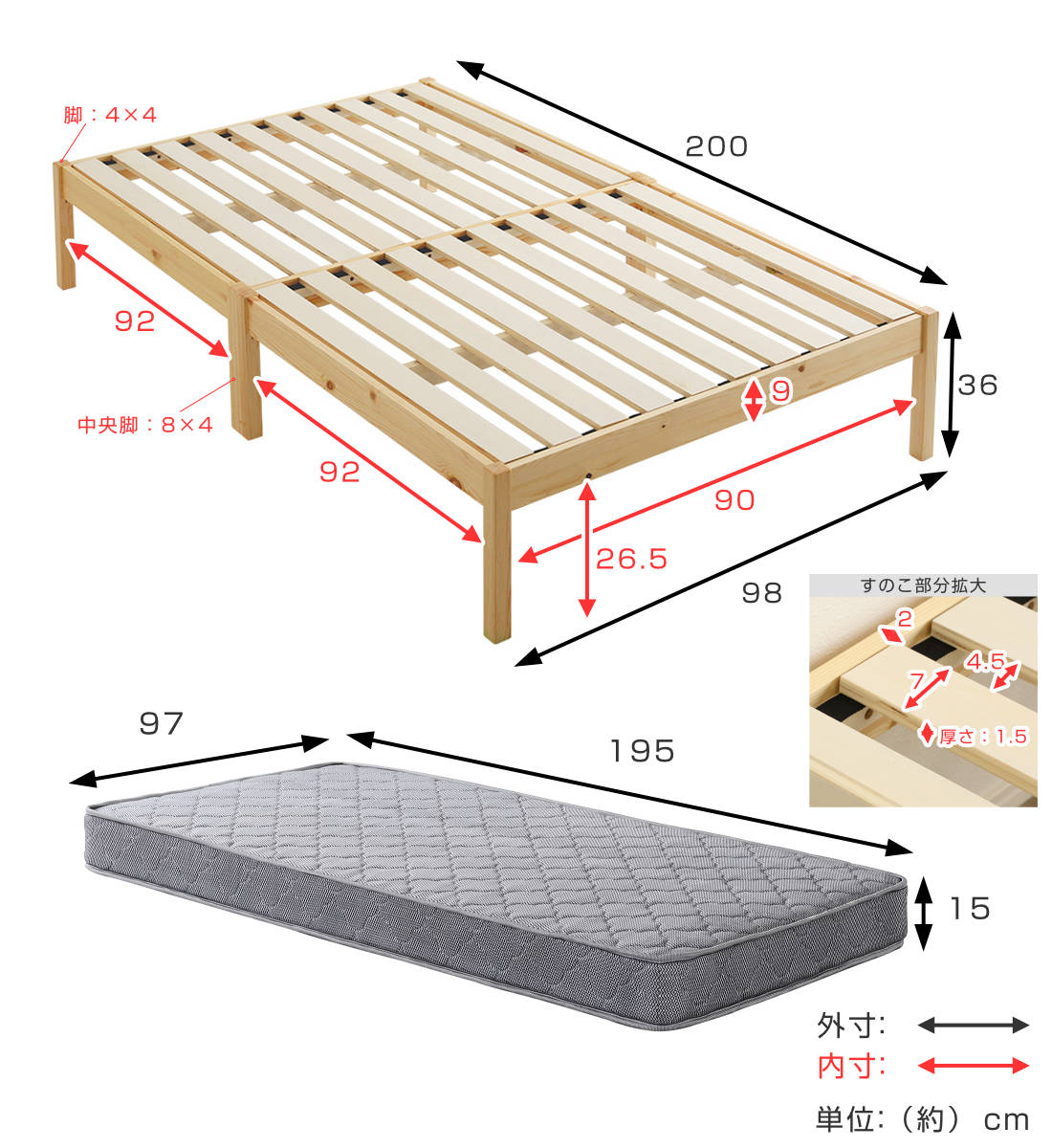 | サイズ | 約 幅98×奥行200×高さ36(cm) マットレス:約 幅97×奥行195×高さ15(cm) |