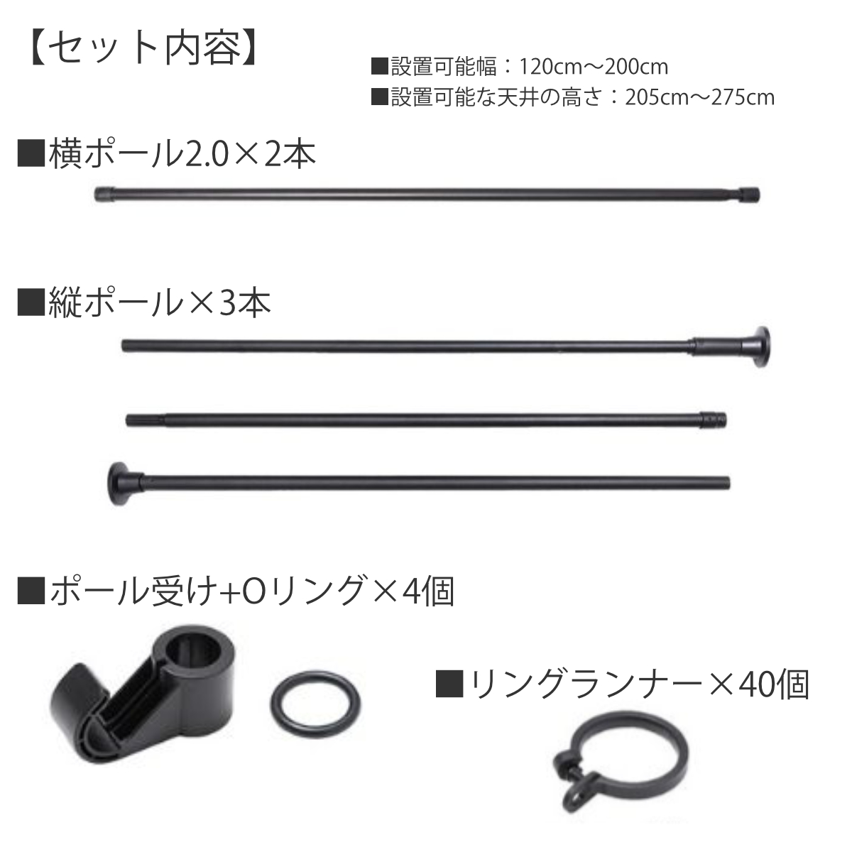 | 内容量 | 1台 (縦ポール×3本、横ポール2.0×2本、ポール受け×4個、リングランナー×40個) |