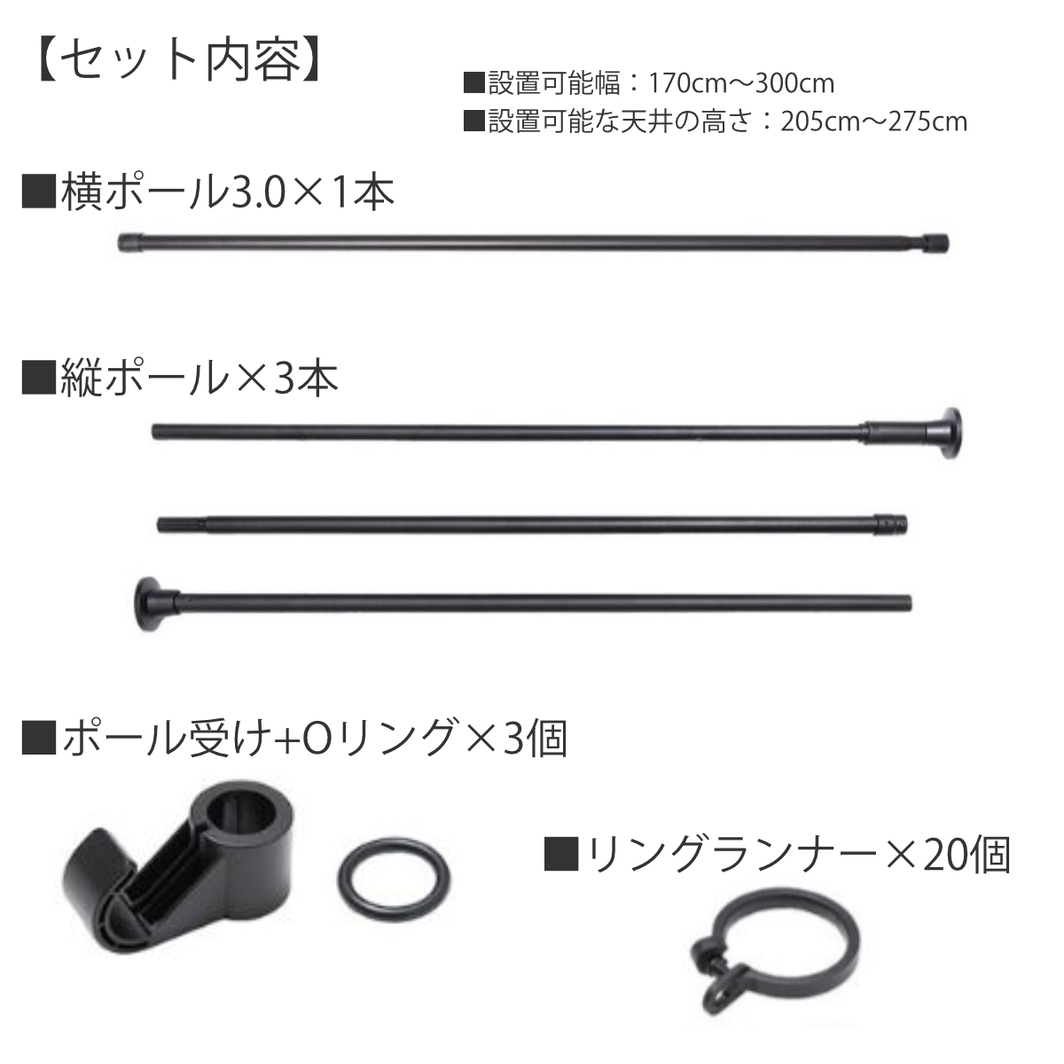 突っ張り カーテンポール 幅170~300cm 支柱あり 間仕切り 目隠し ( つっぱり カーテン ポール カーテンレール 伸縮 高さ調整 幅調整 リング付き 突っ張り式 つっぱり式 パーテーション パーティション 賃貸 マンション アパート ) 【ホワイト】