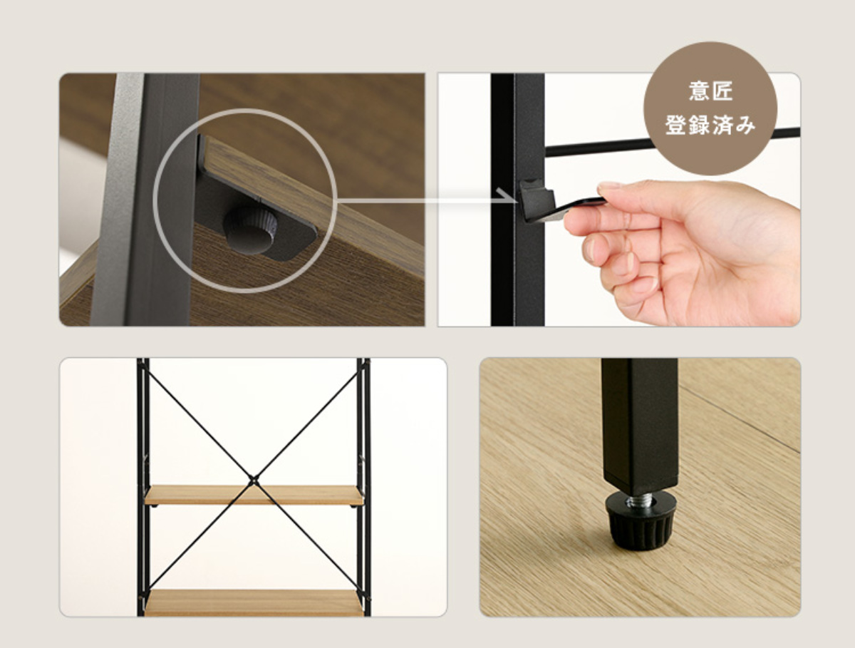 可動棚は、引っ掛けるだけのタイプと異なり、専用パーツでしっかり固定できる仕様です。棚がずれ落ちる心配がなく安心してお使いいただけます。筋交いやアジャスターを備えているので、さらに筋交いやアジャスターを備えているため、床のガタつきや製品の歪みも抑えられます。