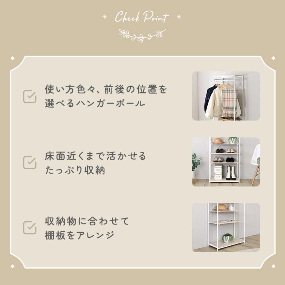 | 耐荷重 | ハンガーポール:10kg 上段・下段固定棚:20kg |