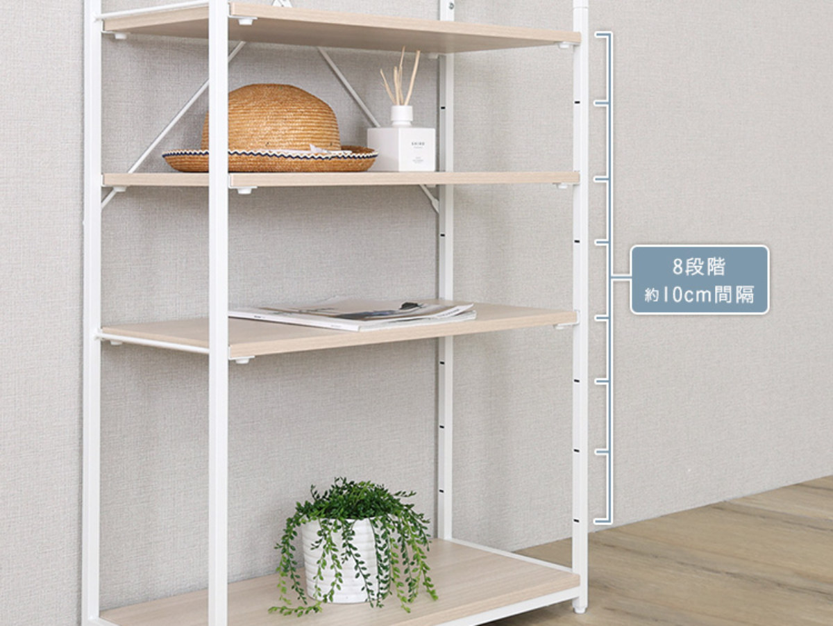 各棚板は10cm間隔で高さ調整が可能です。棚板はフレームにしっかり固定する仕様で、安定した使い心地です。天板と底板は安全にお使いいただくため固定棚となっています。