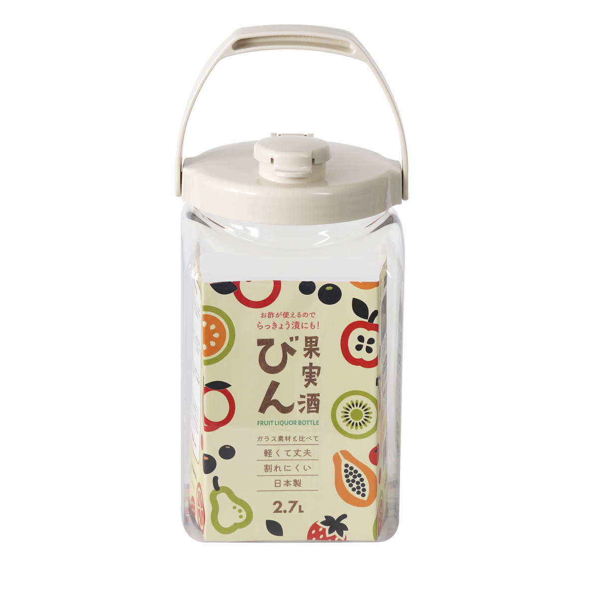 ガラスのような透明感がありながらとても軽く、落としても割れにくいPET素材を使用した果実酒びん2.7Lです。扱いやすく、果実酒づくりが初めての方でも安心して使えます。