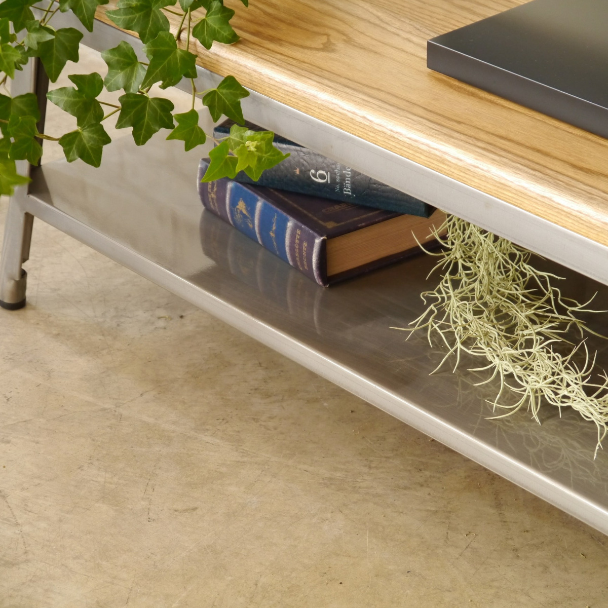 無骨でありながら洗練された印象を与えるスチールフレーム。しっかりとした強度を持ち、テレビや周辺機器を安定して支えます。細身で直線的なフォルムが、空間にシャープなアクセントをプラス。木のやわらかさと組み合わさることで、インダストリアルでありながら重すぎない、絶妙なバランスを生み出します。