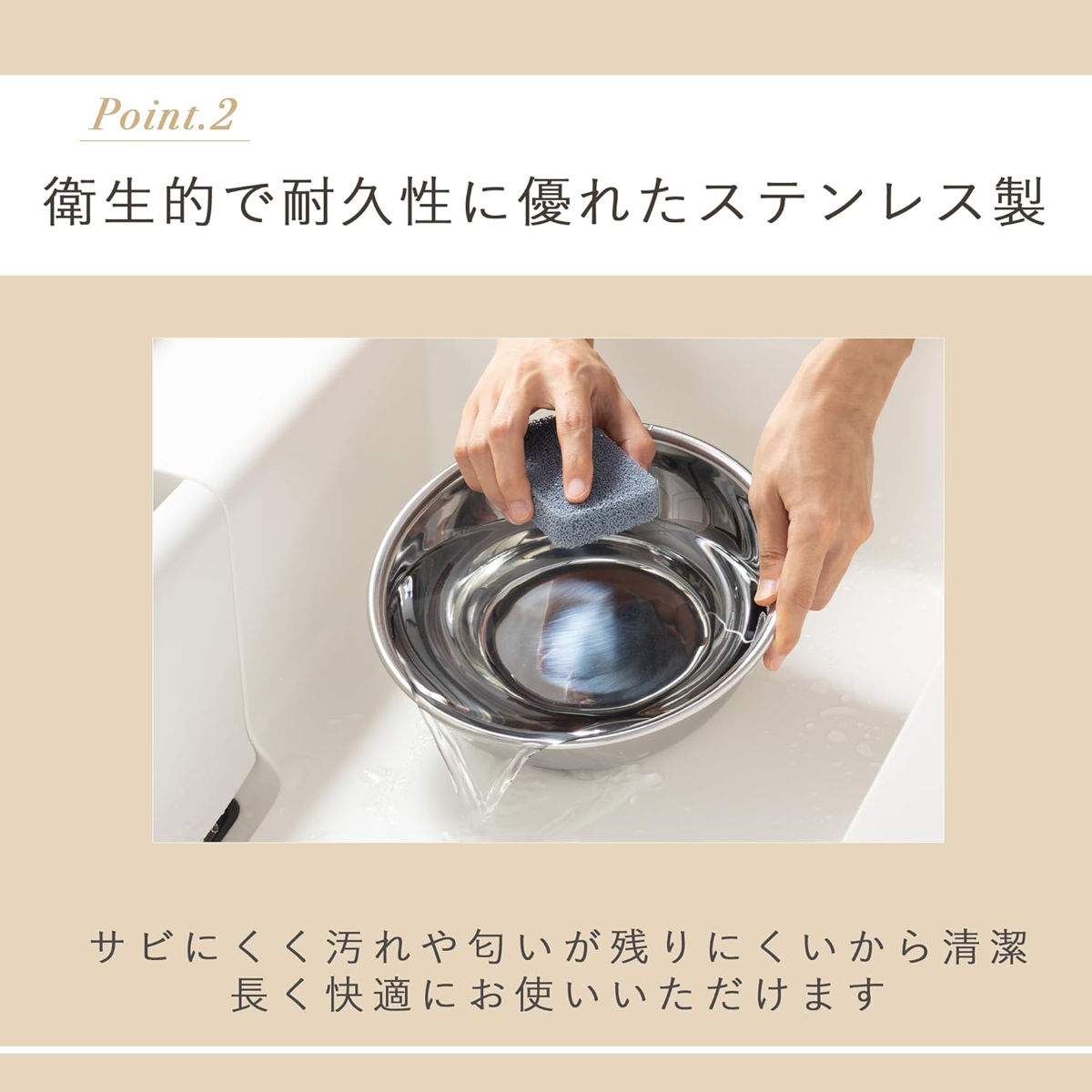 耐久性に優れたステンレス素材を使用しています。汚れが落としやすく、におい移りもしにくいので、毎日清潔にお使いいただけます。