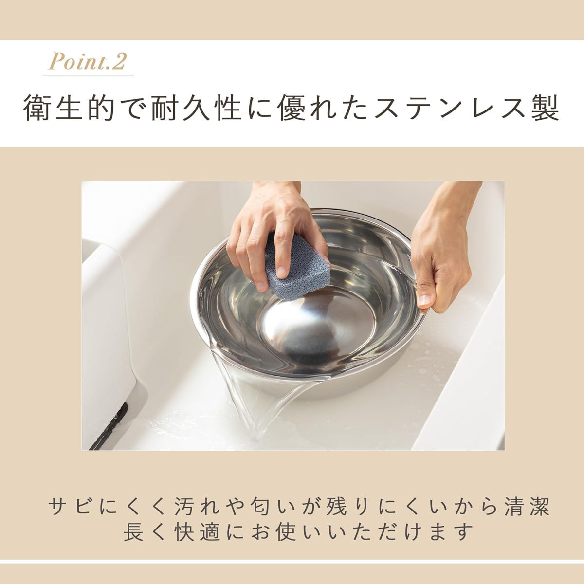 耐久性に優れたステンレス素材を使用しています。汚れが落としやすく、におい移りもしにくいので、毎日清潔にお使いいただけます。
