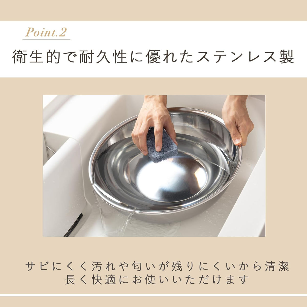 耐久性に優れたステンレス素材を使用しています。汚れが落としやすく、におい移りもしにくいので、毎日清潔にお使いいただけます。