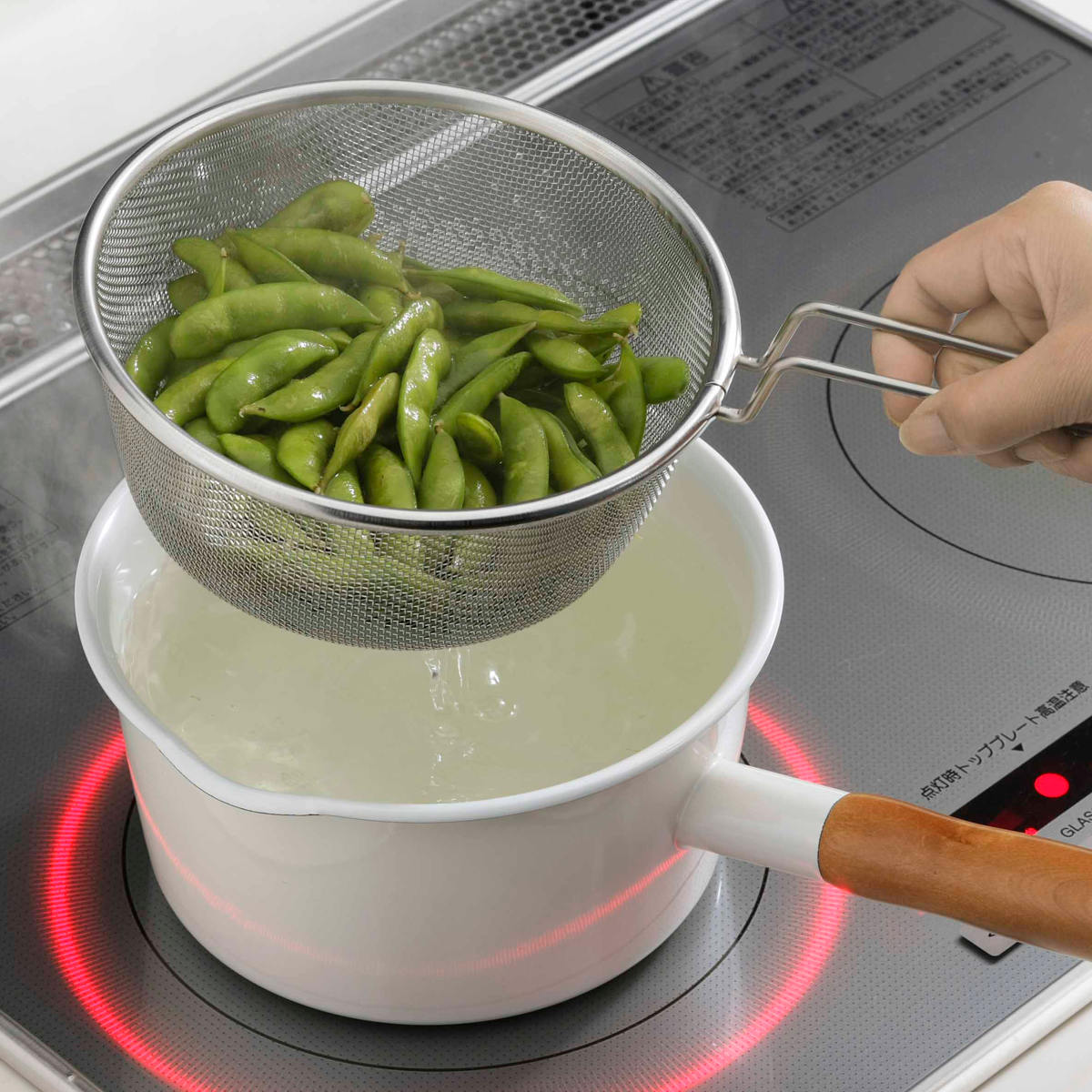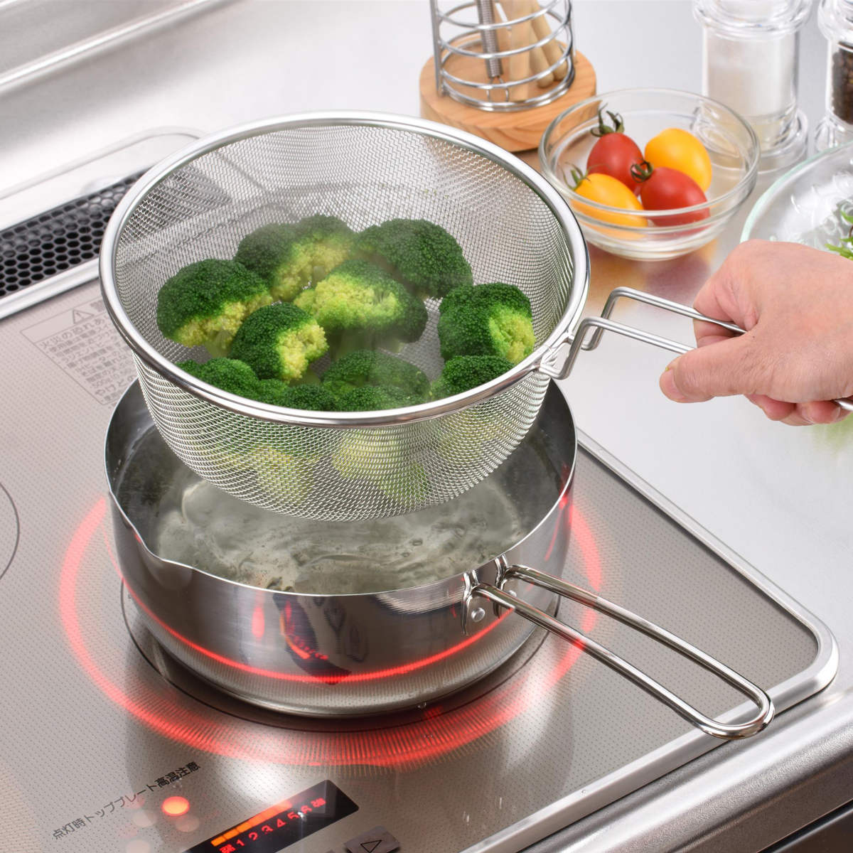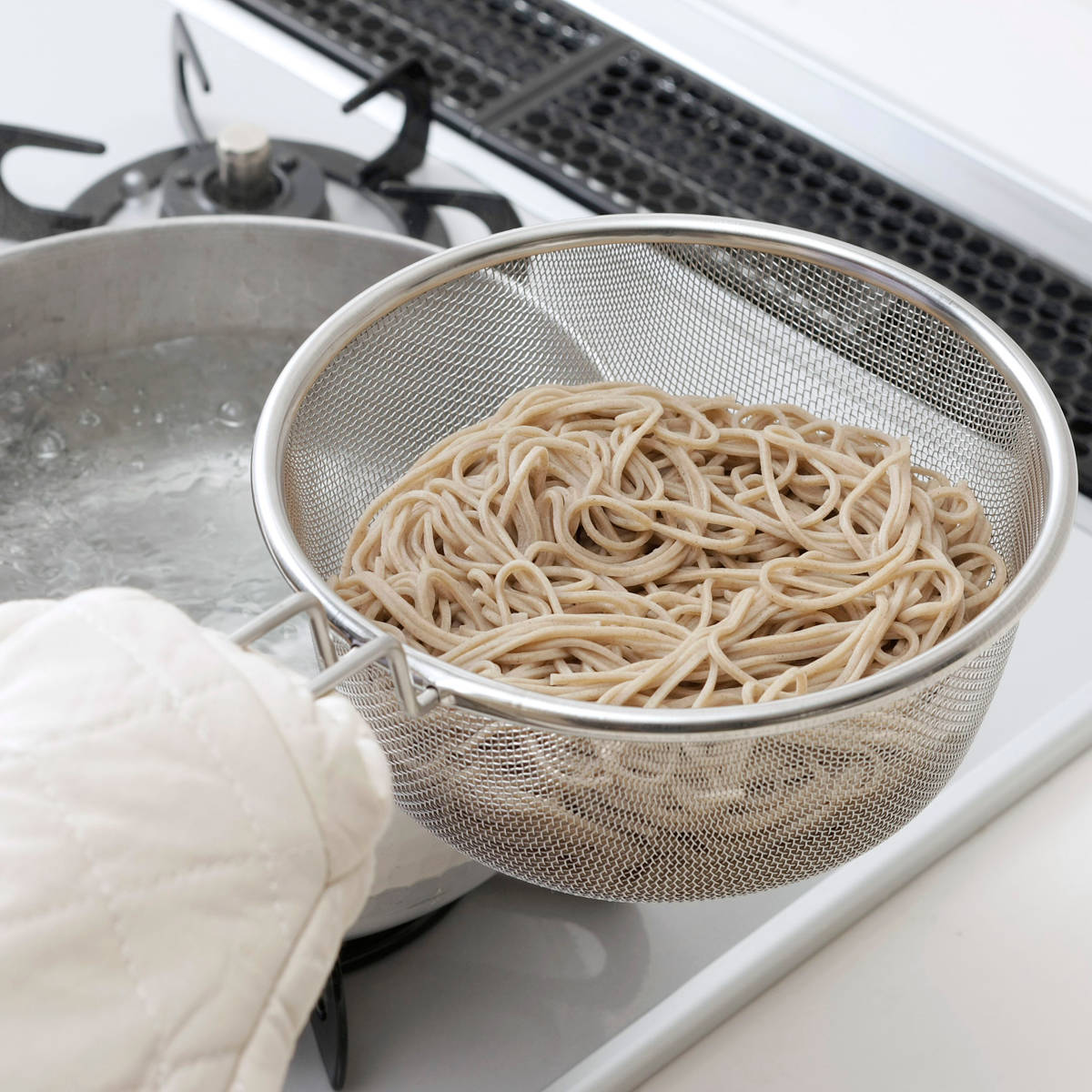 細かい網目で麺が飛び出しにくく、麺類やパスタ、野菜の茹で上げに便利です。茹で上げた食材の水切りにも使えます。