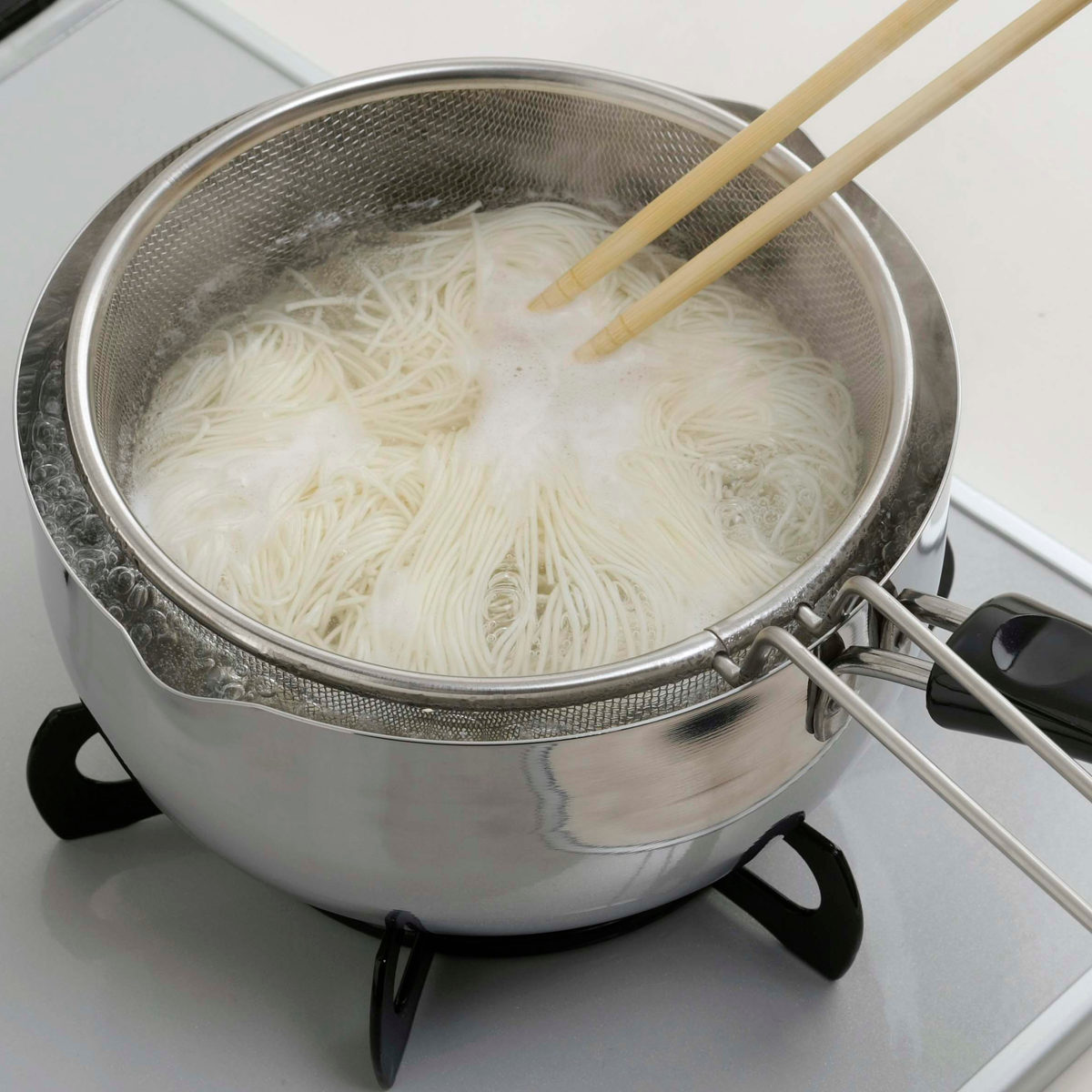 持ち手付きで取り出しやすく、茹で上がった食材をすぐに引き上げられます。麺や野菜を茹ですぎにくく、ちょうどよい茹で加減に仕上げられます。