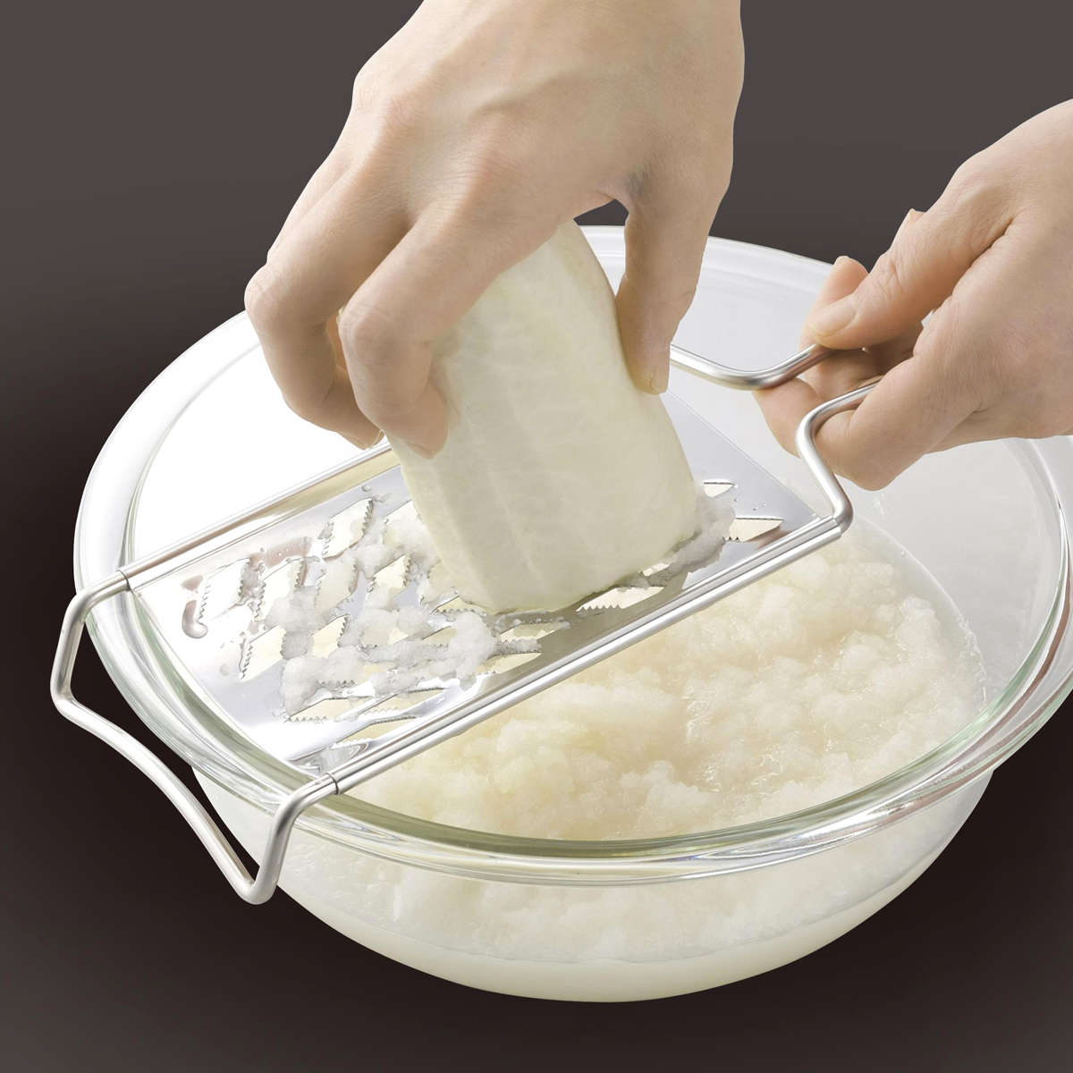 フチに引っ掛けやすい形状で、作業中もぐらつかず安定して使えます。ボウルにしっかりセットできるため、おろした食材をそのまま受け止められ、調理がスムーズです。