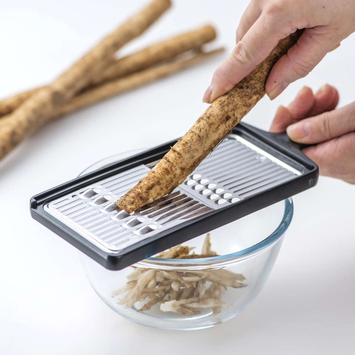 押し削りタイプなので、野菜の繊維を粗く断ち切り表面をざらざらに仕上げます。そのため味がしみ込みやすく、和え物やきんぴらにぴったりの千切りが作れます。