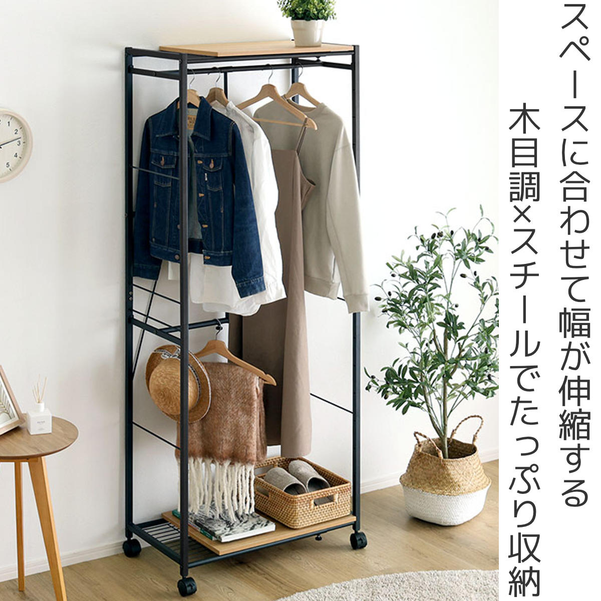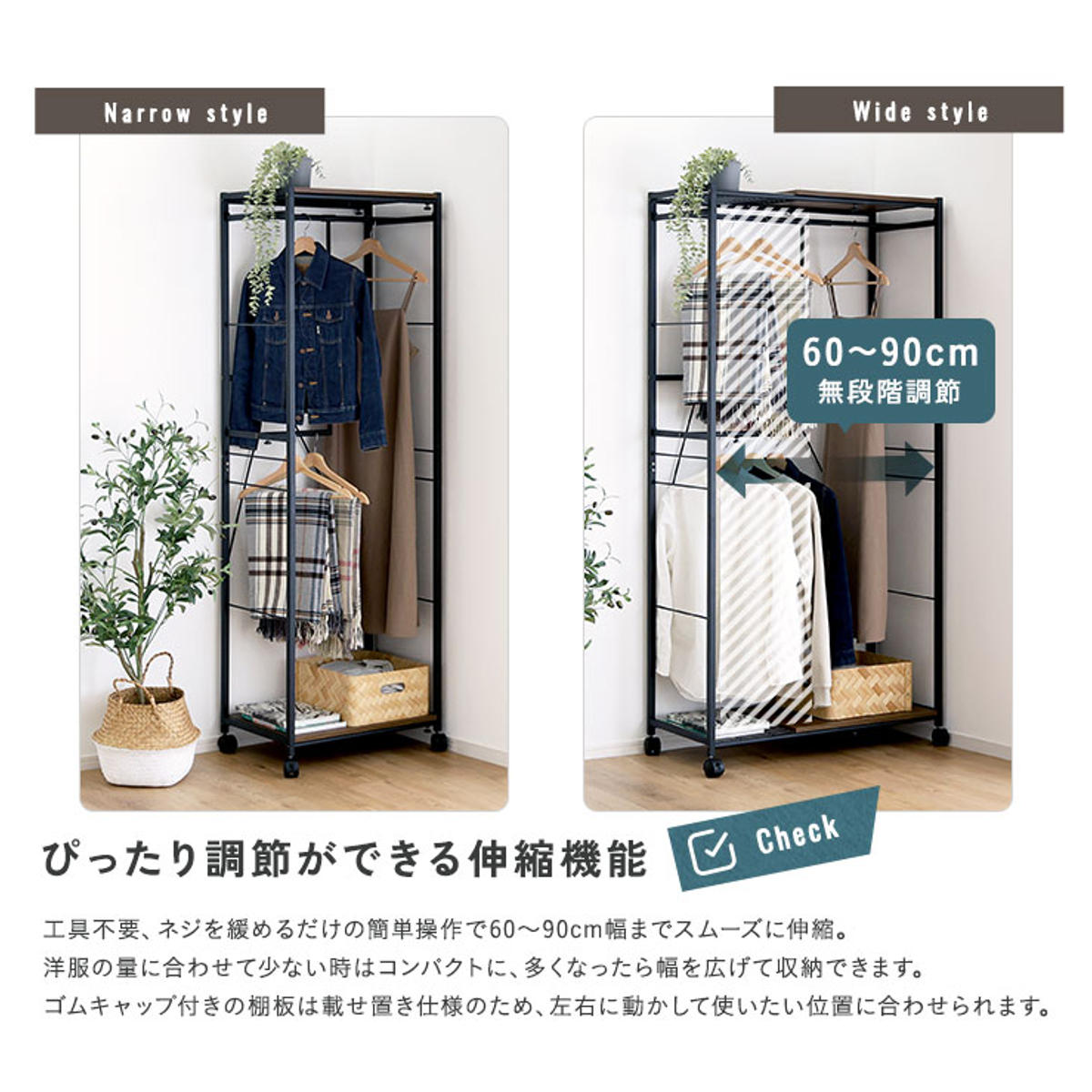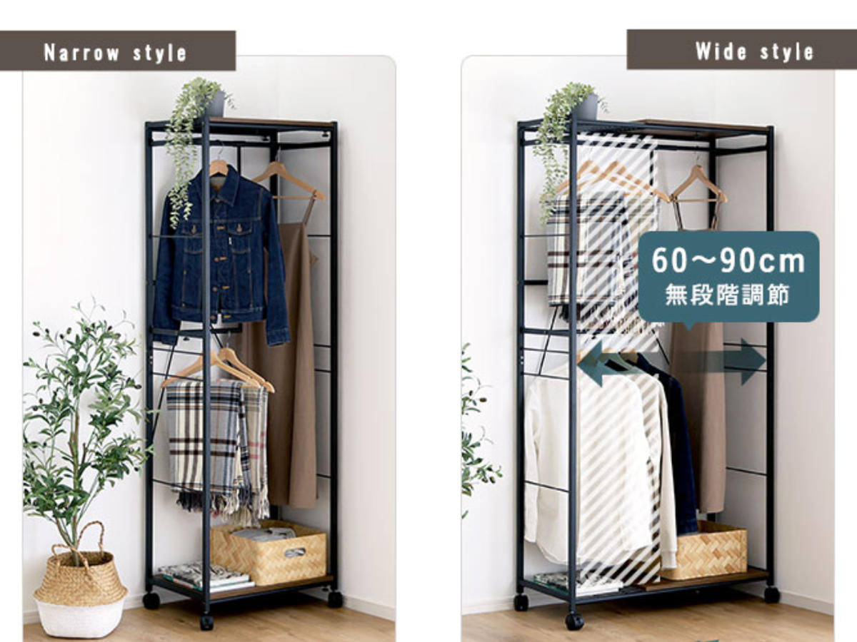 幅は60~90cmまでスムーズに伸縮できます。洋服の量に合わせて、少ないときはコンパクトに、多いときは広げてたっぷり収納。工具不要で、ネジを緩めるだけの簡単操作。棚板は載せ置き仕様で、左右に動かして使いやすい位置に調整できます。