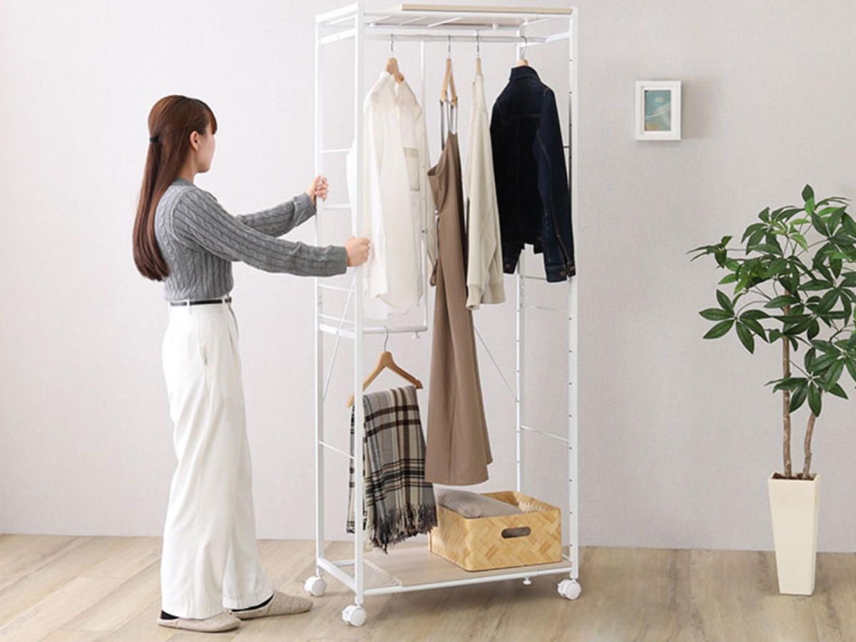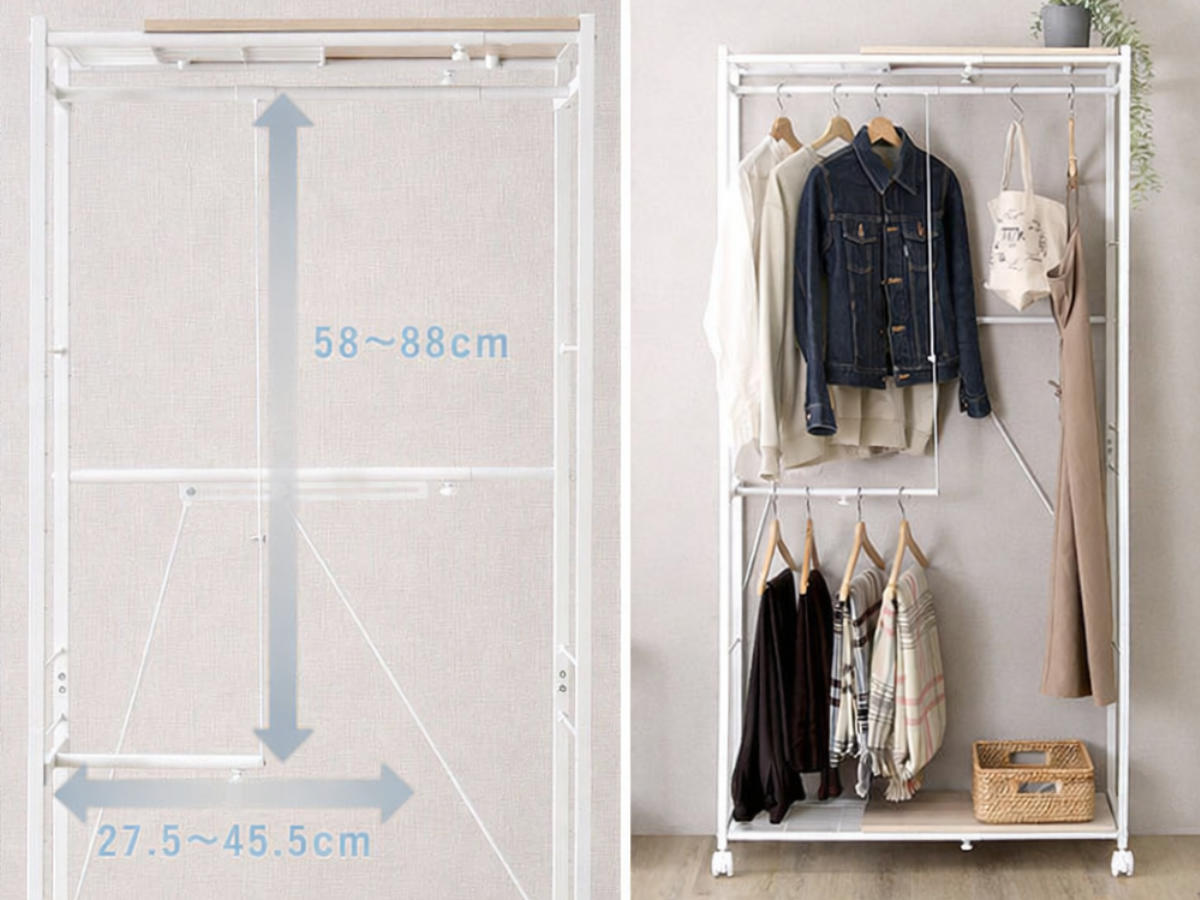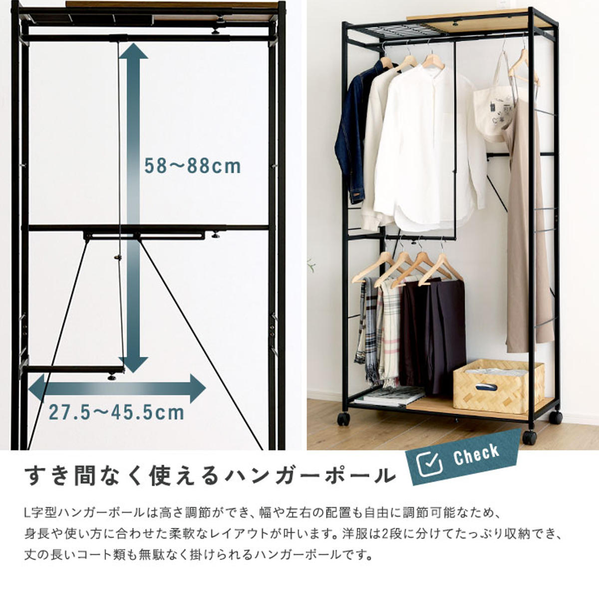 L字型のハンガーポールは、幅や高さを自由に調整可能。左右の配置も変えられるため、使い方に合わせたレイアウトができます。衣類を2段に分けてたっぷり収納でき、丈の長いワンピースやコート類もすっきり掛けられます。