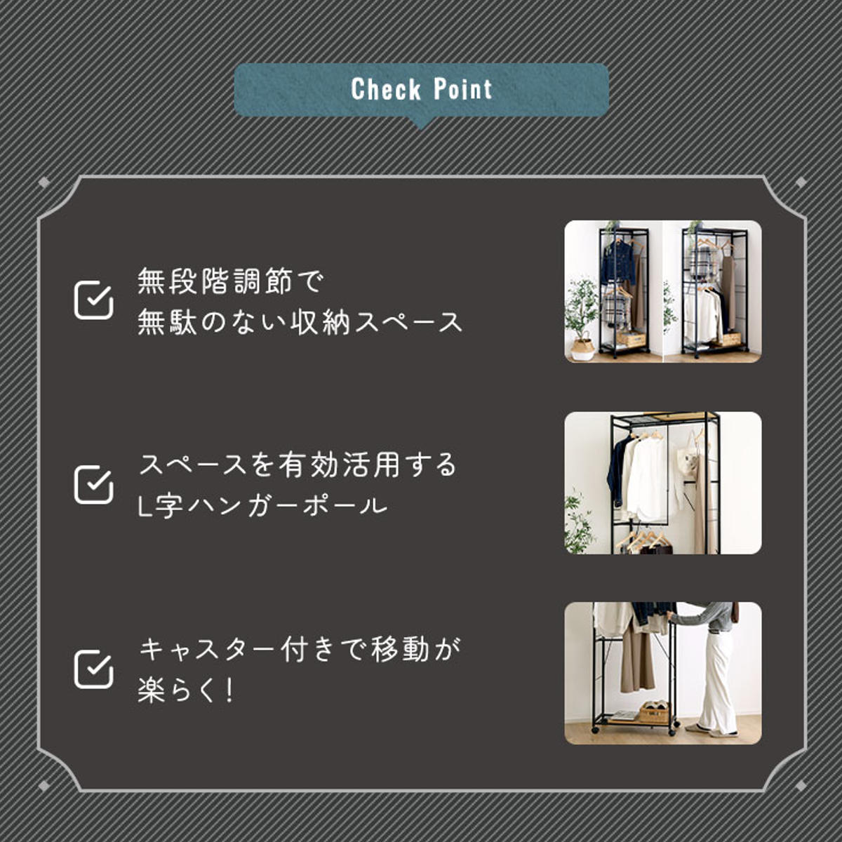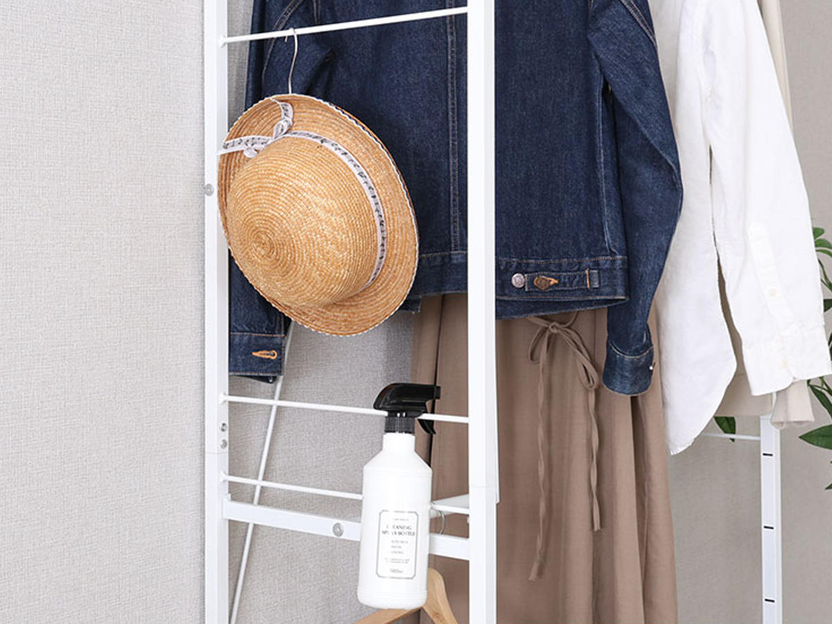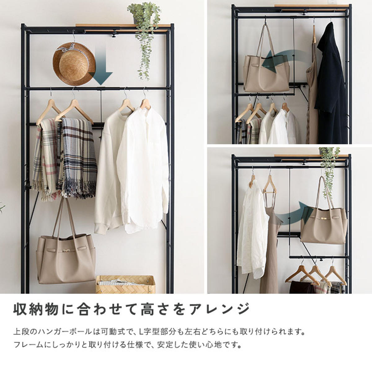L字型のハンガーポールは、幅や高さを自由に調整可能。左右の配置も変えられるため、使い方に合わせたレイアウトができます。衣類を2段に分けてたっぷり収納でき、丈の長いワンピースやコート類もすっきり掛けられます。