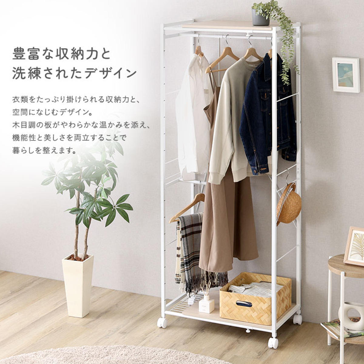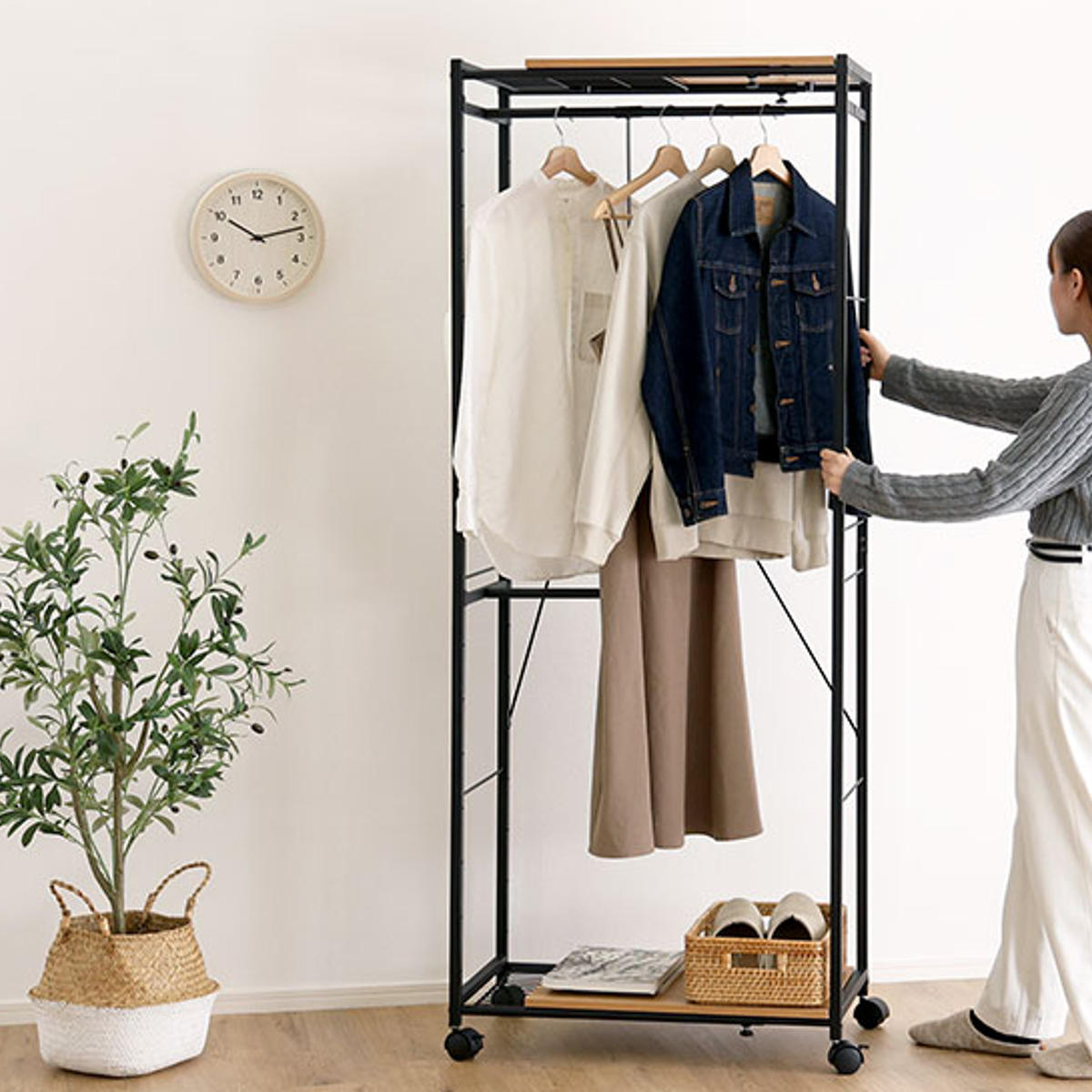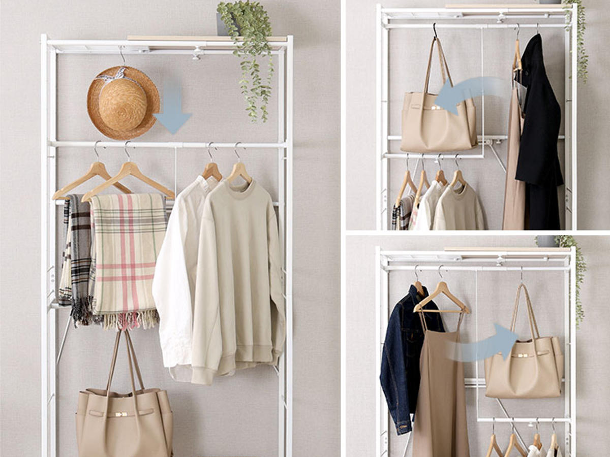 上段のハンガーポールは可動式で、収納するアイテムに合わせて柔軟に調整可能。使い勝手の良い設計で、効率よく収納できます。