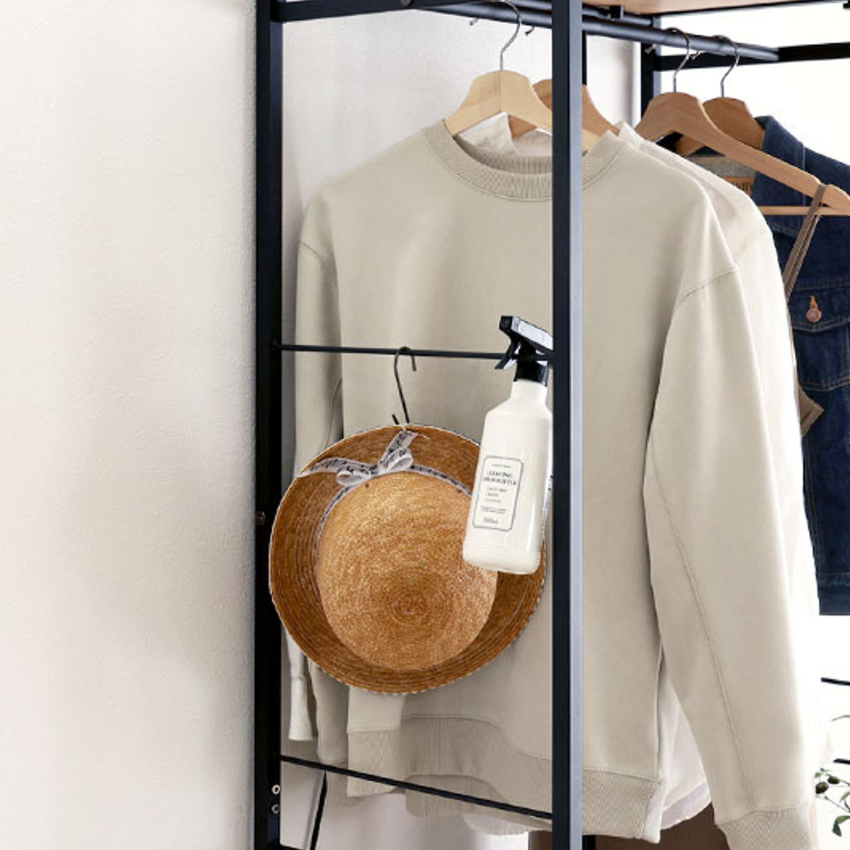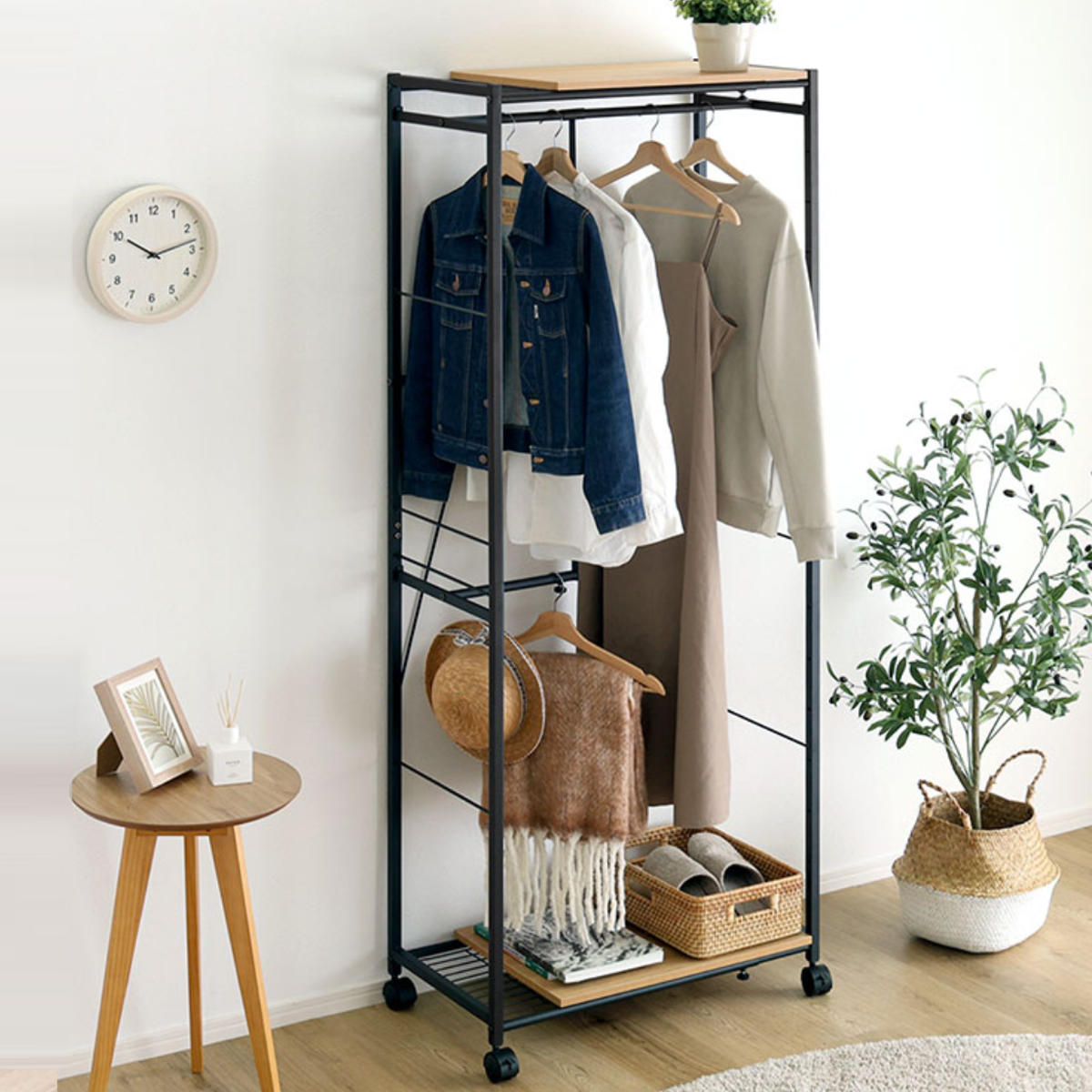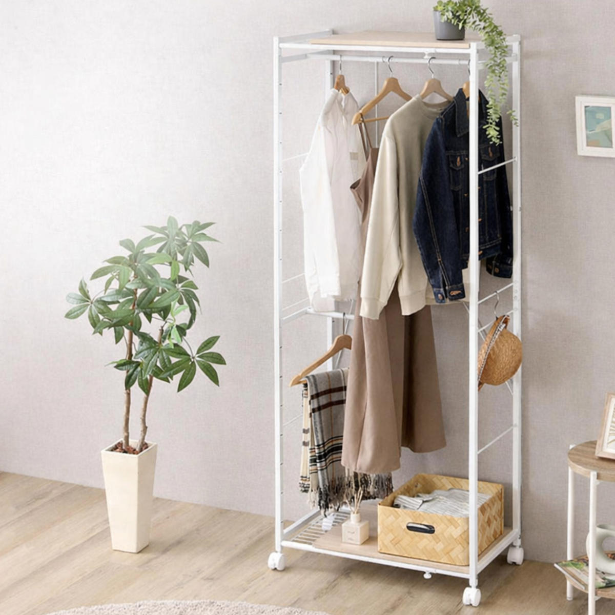 上段のハンガーポールは可動式で、収納するアイテムに合わせて柔軟に調整可能。使い勝手の良い設計で、効率よく収納できます。