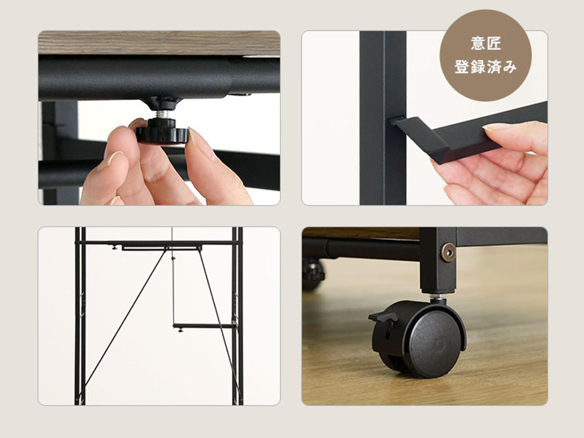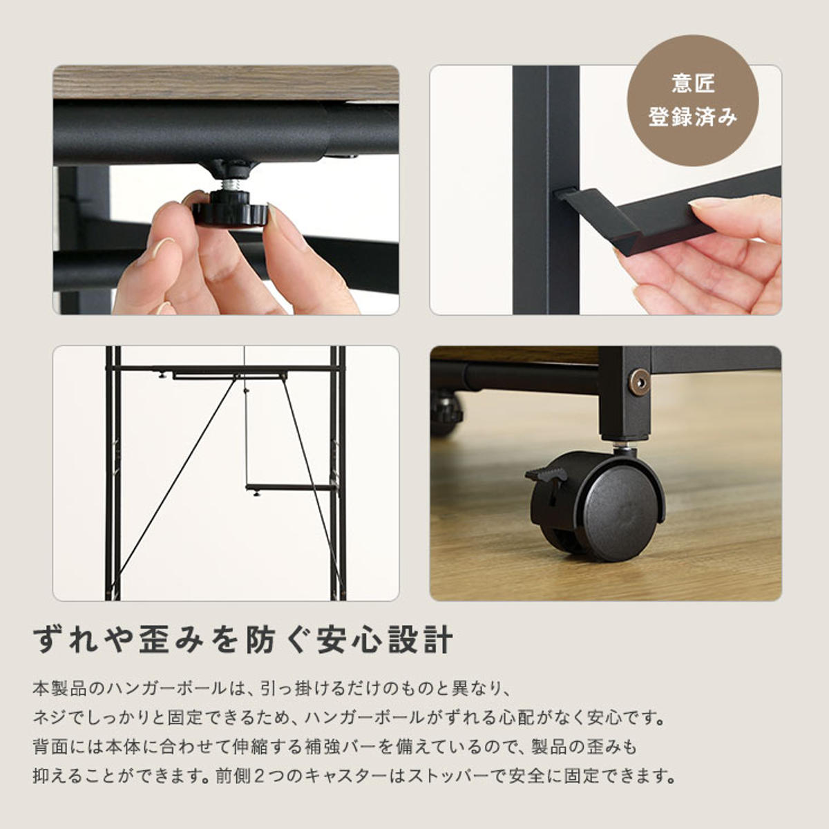 ハンガーポールは引っ掛け式ではなく、ネジでしっかり固定する仕様。ズレや落下の心配がなく、安心して使えます。背面には伸縮式の補強バーを備えており、ぐらつきや歪みを抑えます。キャスターはストッパー付きで固定も安心です。