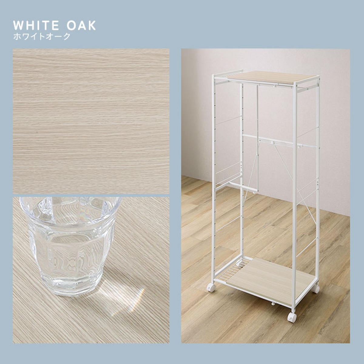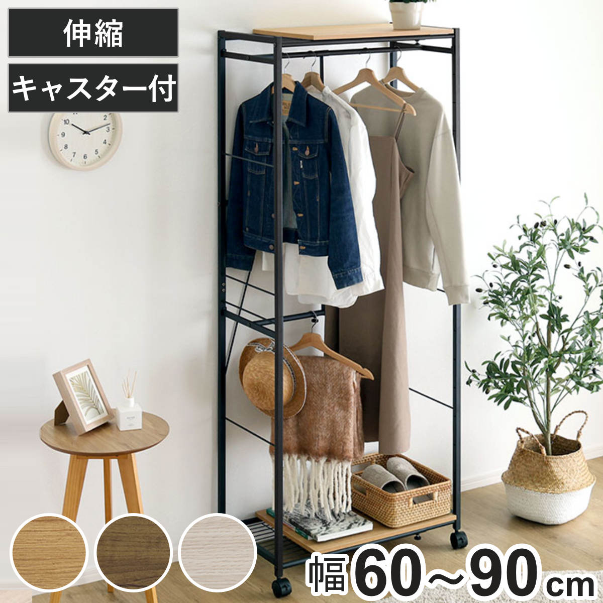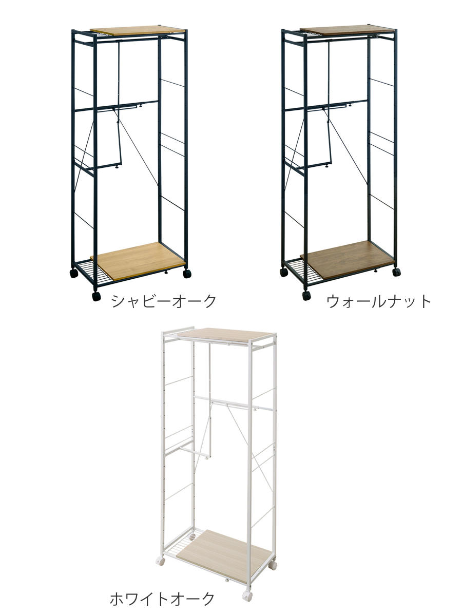 ハンガーラック 幅60~90cm 伸縮 木目調 キャスター付き ( ラック 棚 伸長式 衣類収納 コート掛け 無段階調節 高さ調節 L字型 収納 家具 シャビーオーク ウォールナット ホワイトオーク ) 【ホワイトオーク】