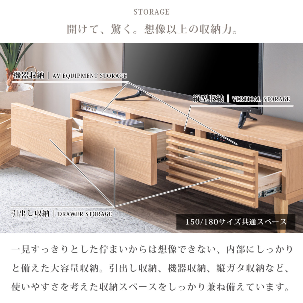 すっきりとした見た目からは想像できない、大容量収納を確保しています。 引出し・機器収納・縦型収納をバランスよく備え、リビングをすっきり整えます。