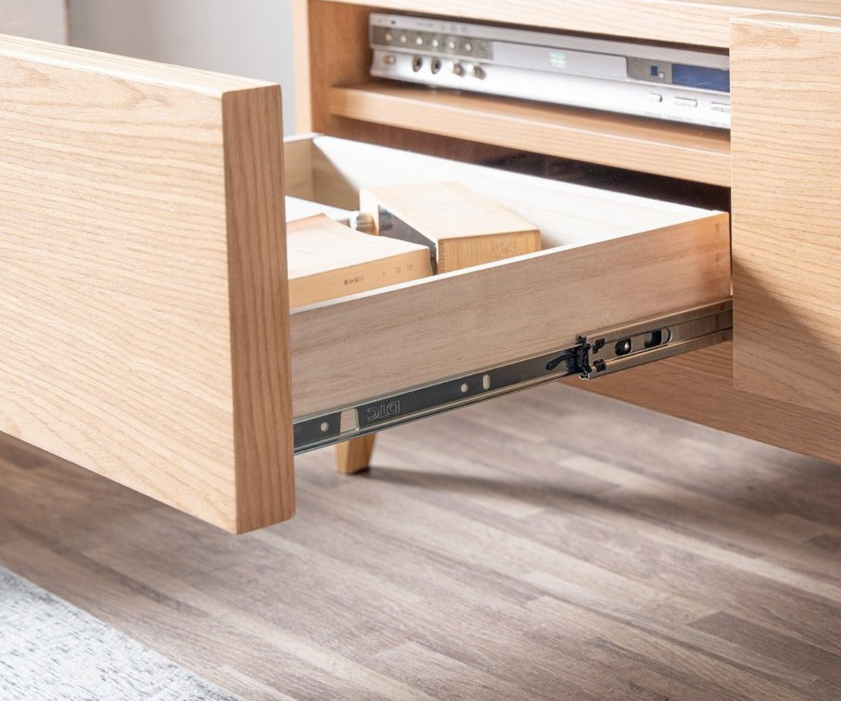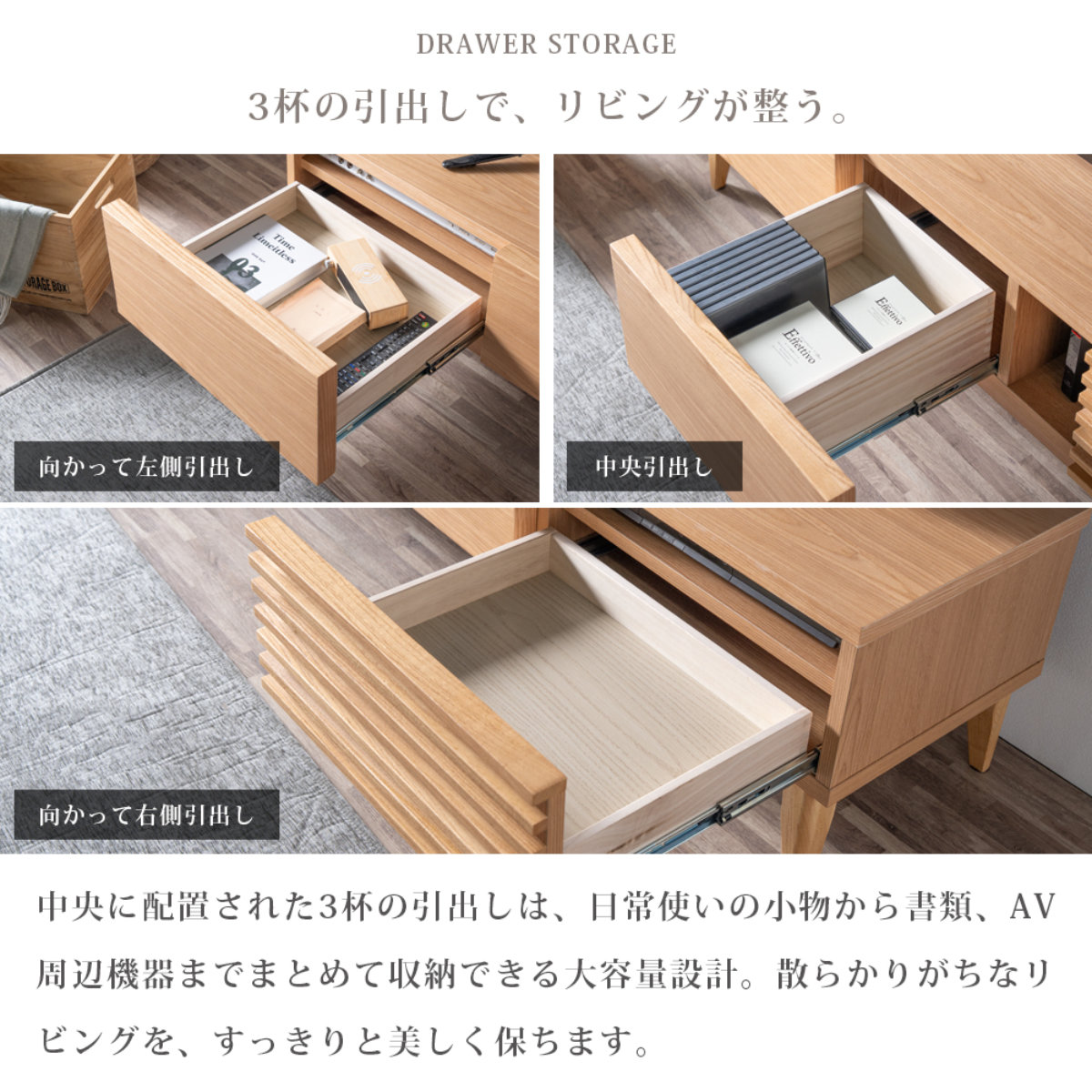 中央に配置された3杯の引出しは、日常小物から書類、AV周辺機器までしっかり収納できる大容量設計です。 細かいものもまとめて片付き、リビングを美しく保てます。
