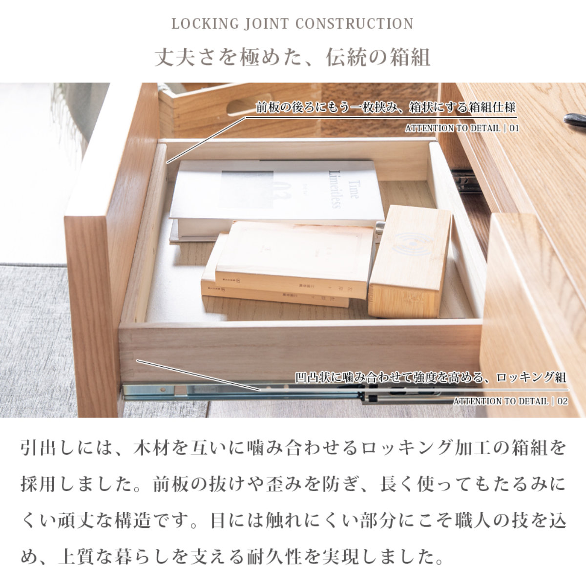 引出しにはロッキング加工を採用しており、勢いよく引いても抜け落ちず安心です。さらにフルオープンレール仕様で、奥の収納もラクに取り出せます。