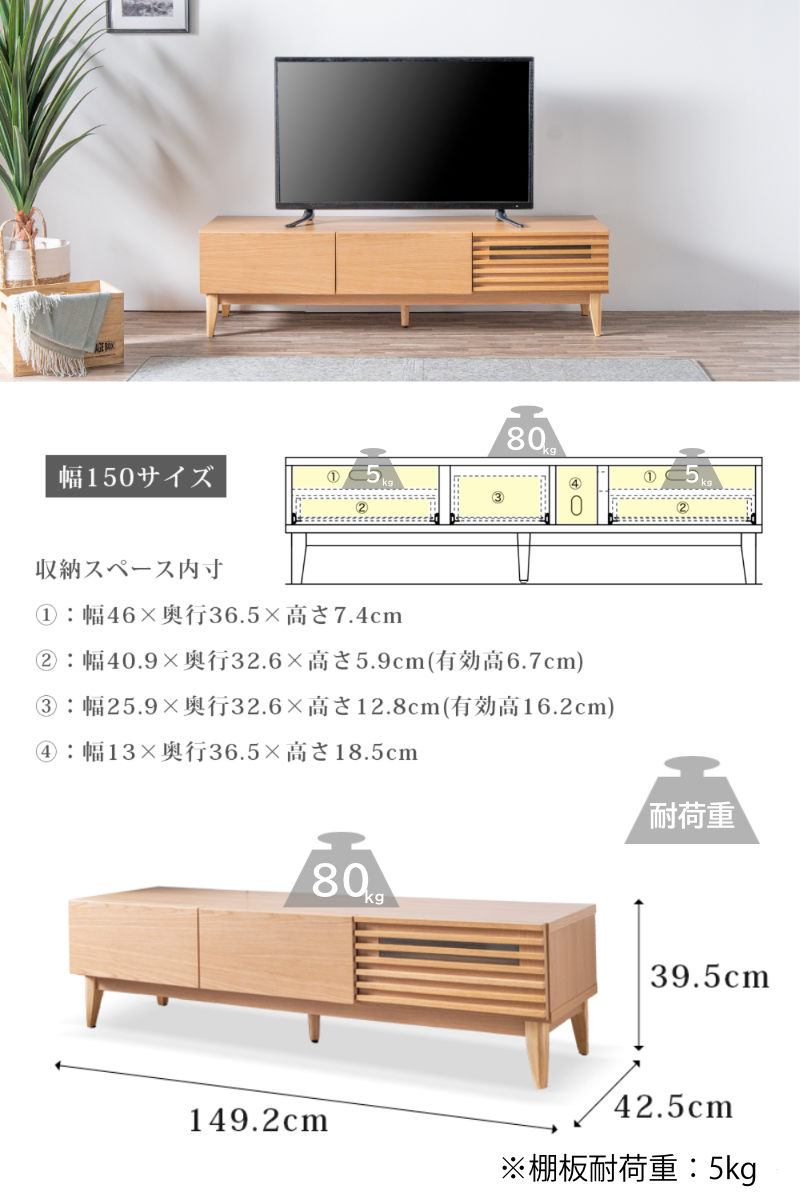 幅149.2cm、静止耐荷重80kgで、60型までの大型テレビに対応しています。