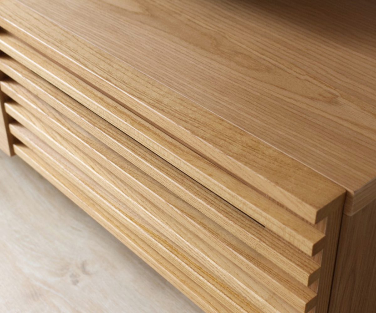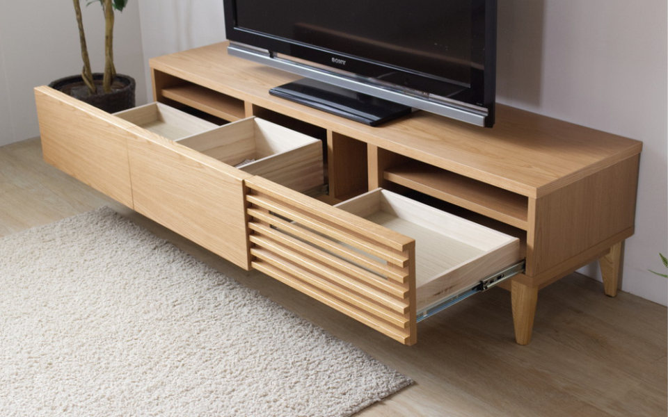 引出しやデッキ収納を備えた実用性に加え、ルーバーデザインが生む陰影が空間に奥行きをプラスします。様々なテイストに調和し、お部屋全体を心地よい雰囲気に整えます。テレビ台でありながら「見せる家具」としても楽しめます。