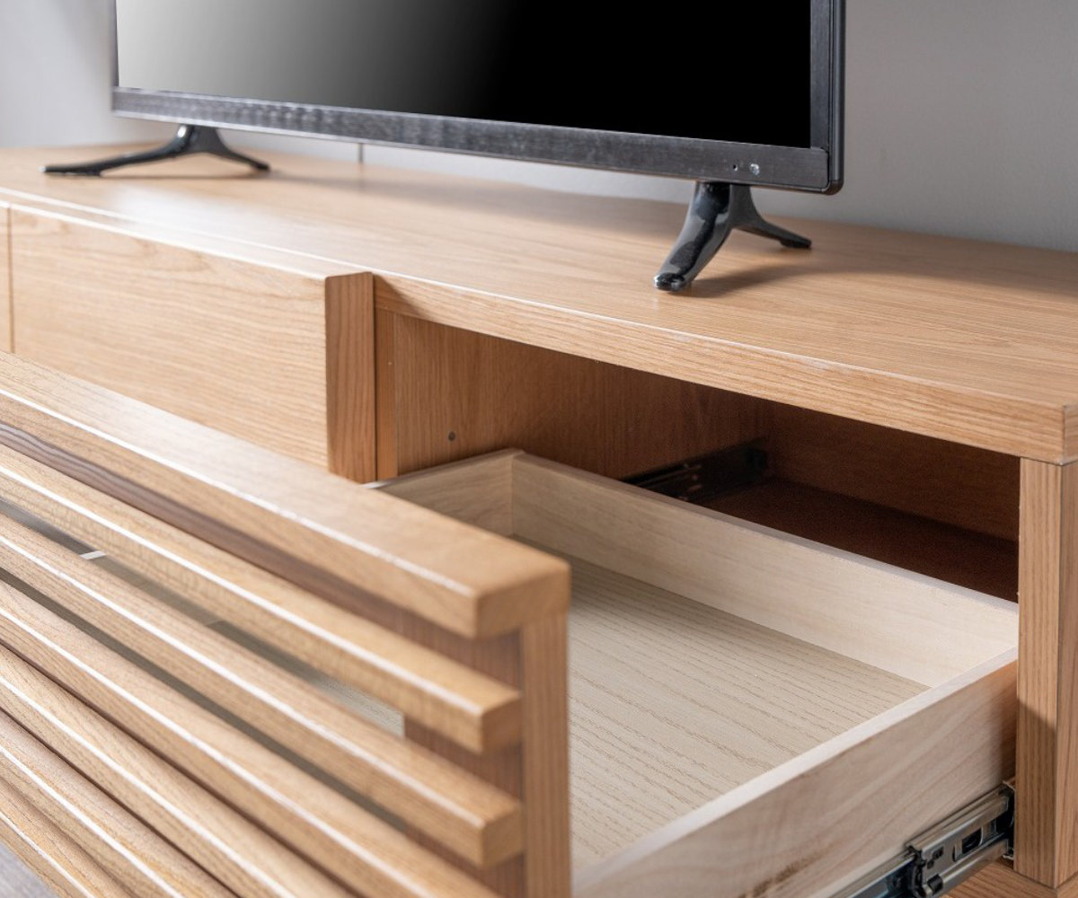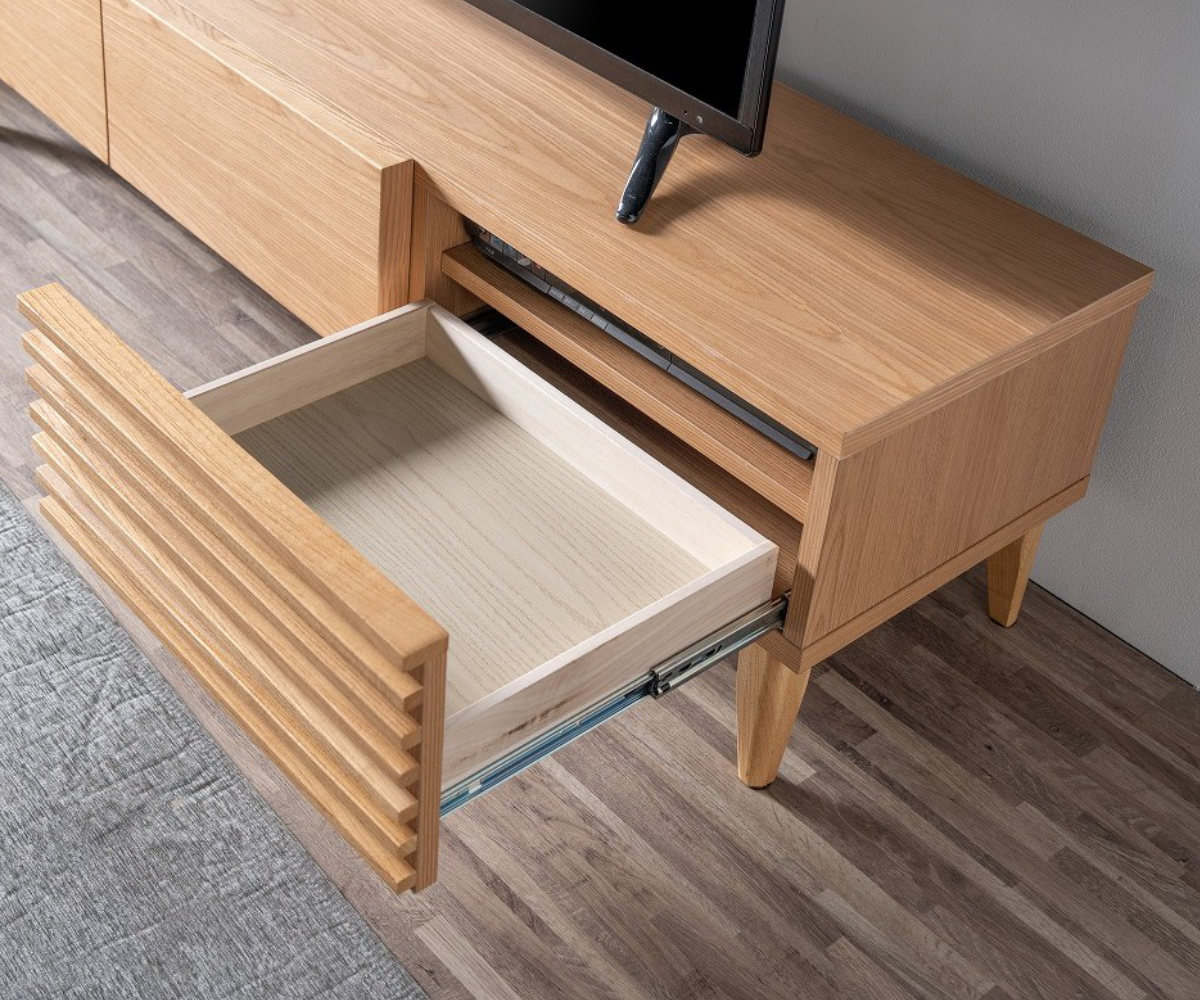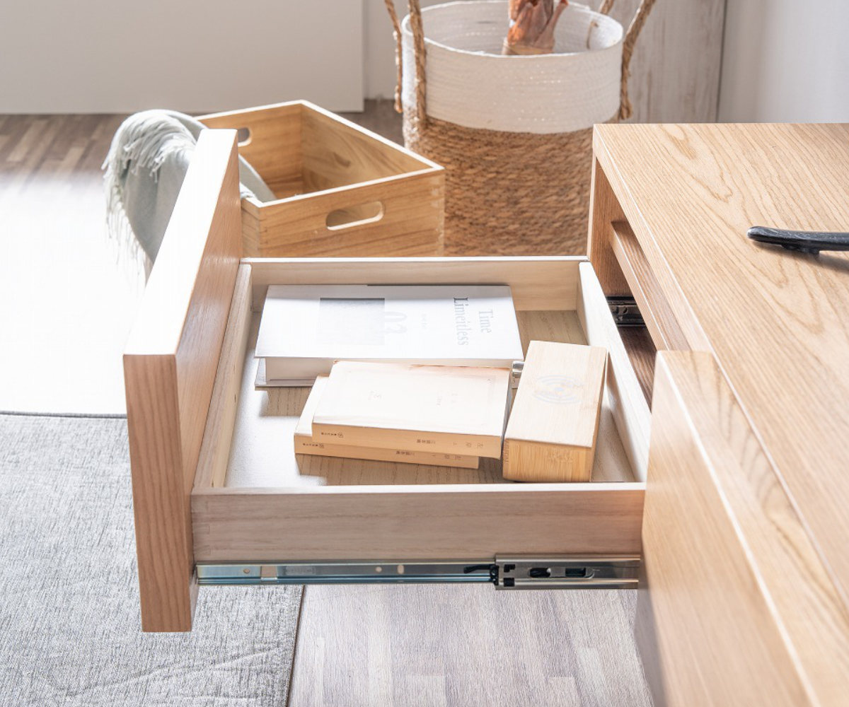 中央に配置された3杯の引出しは、日常小物から書類、AV周辺機器までしっかり収納できる大容量設計です。 細かいものもまとめて片付き、リビングを美しく保てます。