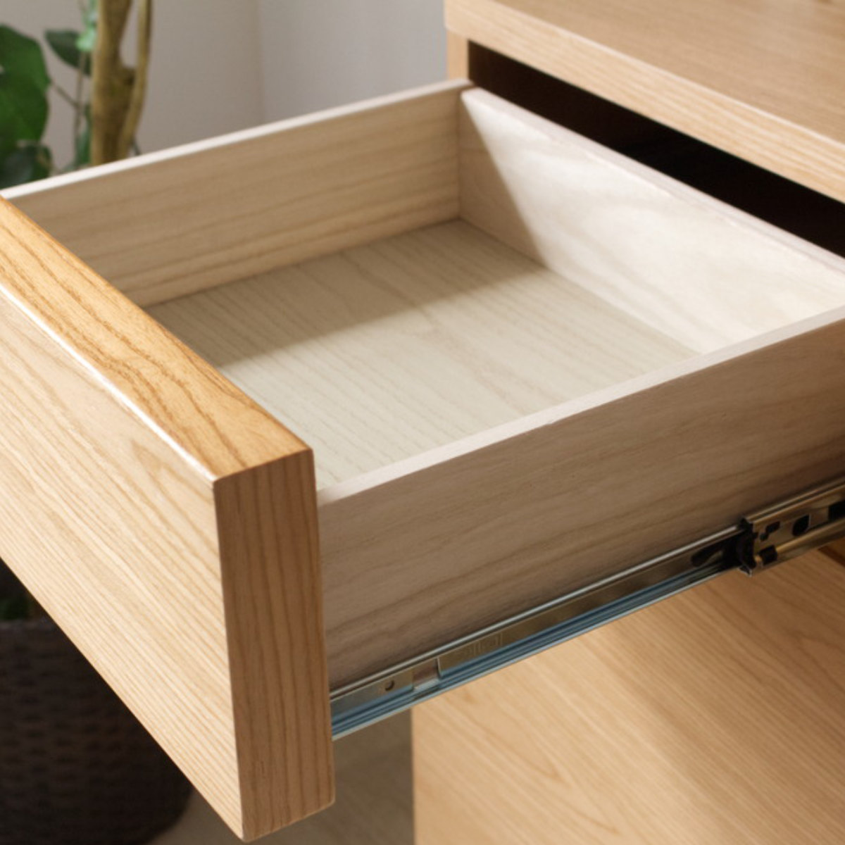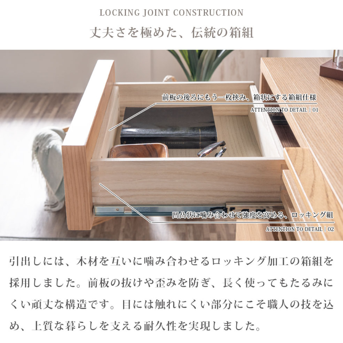 引出しにはロッキング加工を採用しており、勢いよく引いても抜け落ちず安心です。さらにフルオープンレール仕様で、奥の収納もラクに取り出せます。