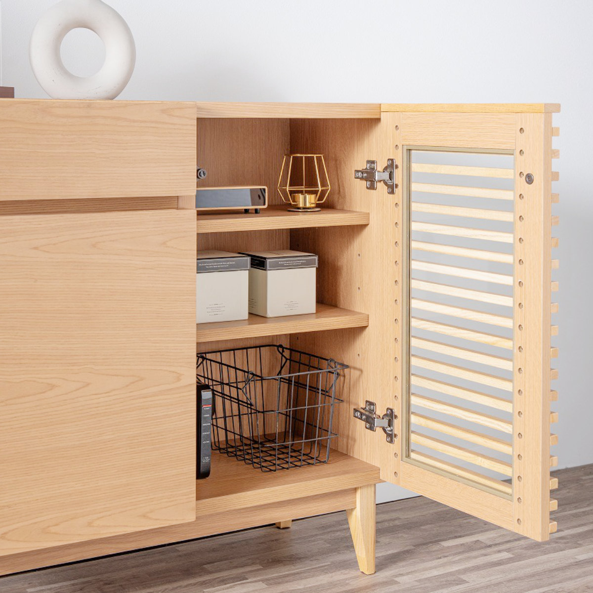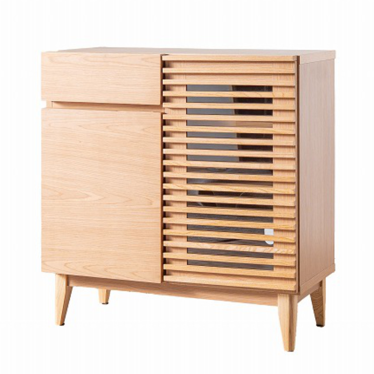 光を通す木製ルーバーで上品な印象です。ガラス貼りなので扉を閉じたままリモコン操作ができます。