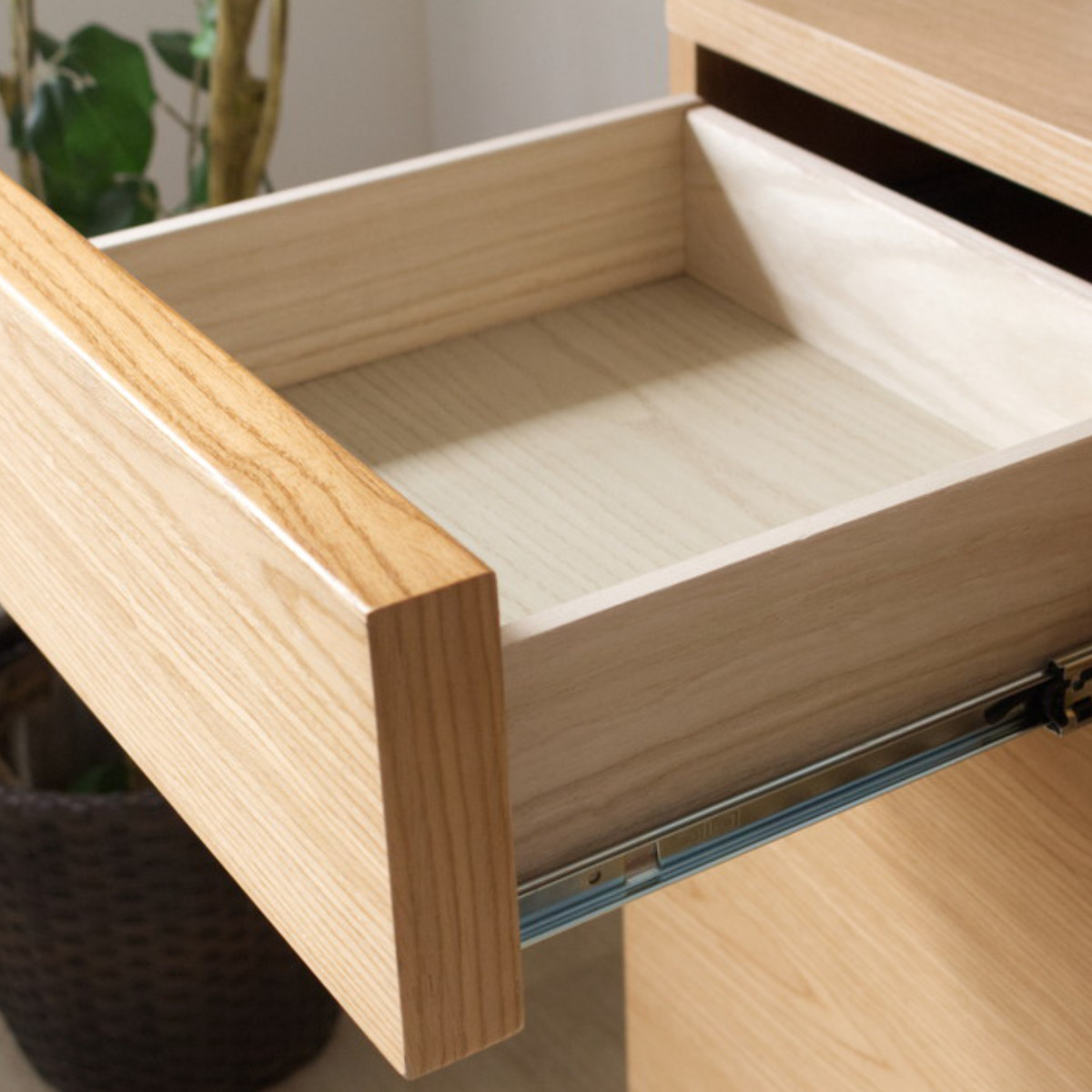 引出しにはロッキング加工を採用しており、勢いよく引いても抜け落ちず安心です。さらにフルオープンレール仕様で、奥の収納もラクに取り出せます。